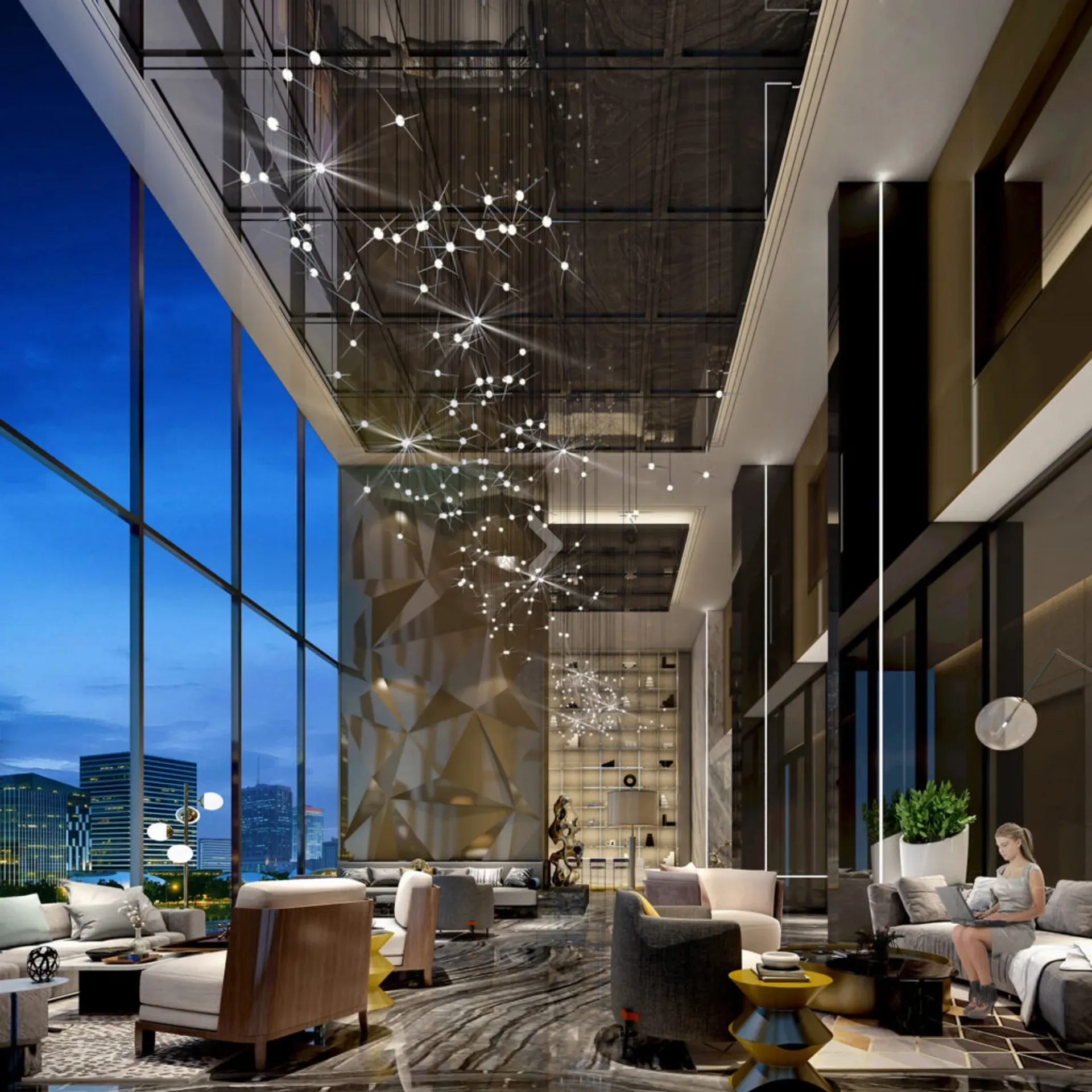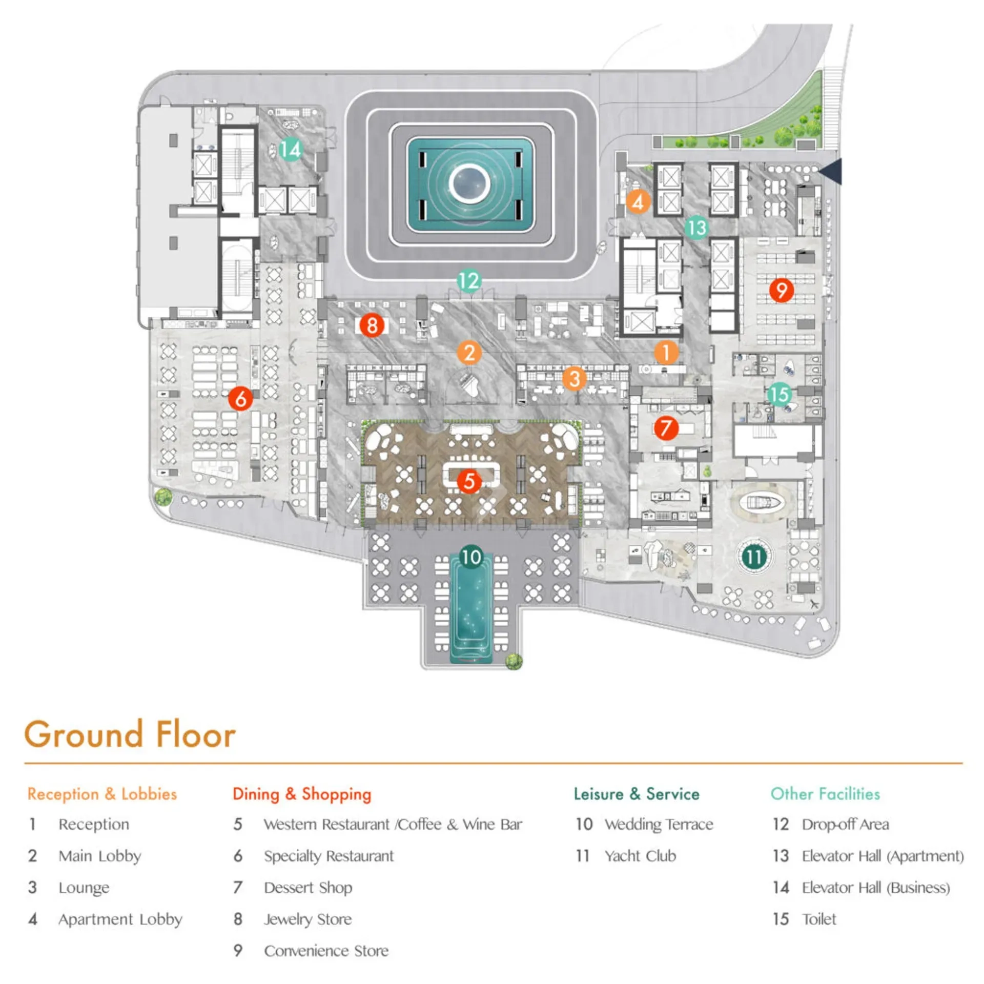 - 1F-2F: Lobby Reception, Concierge, All-day Dining and Restaurants, Café Bar, Lounge, Lifestyle Retail and Service