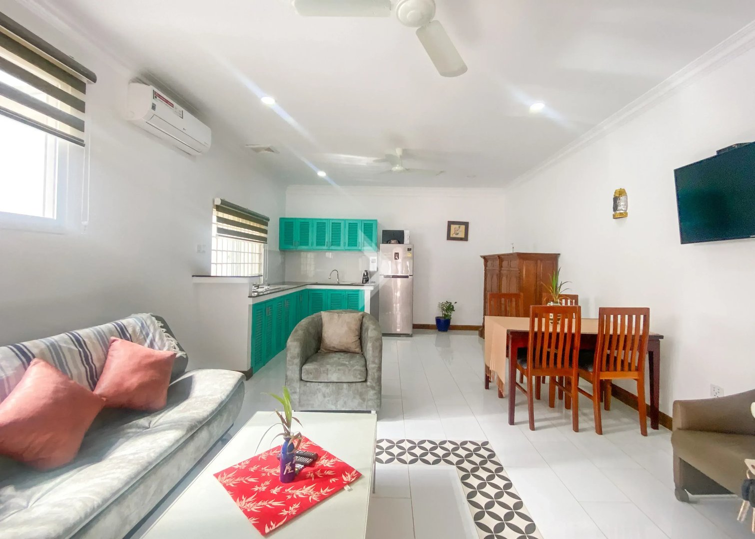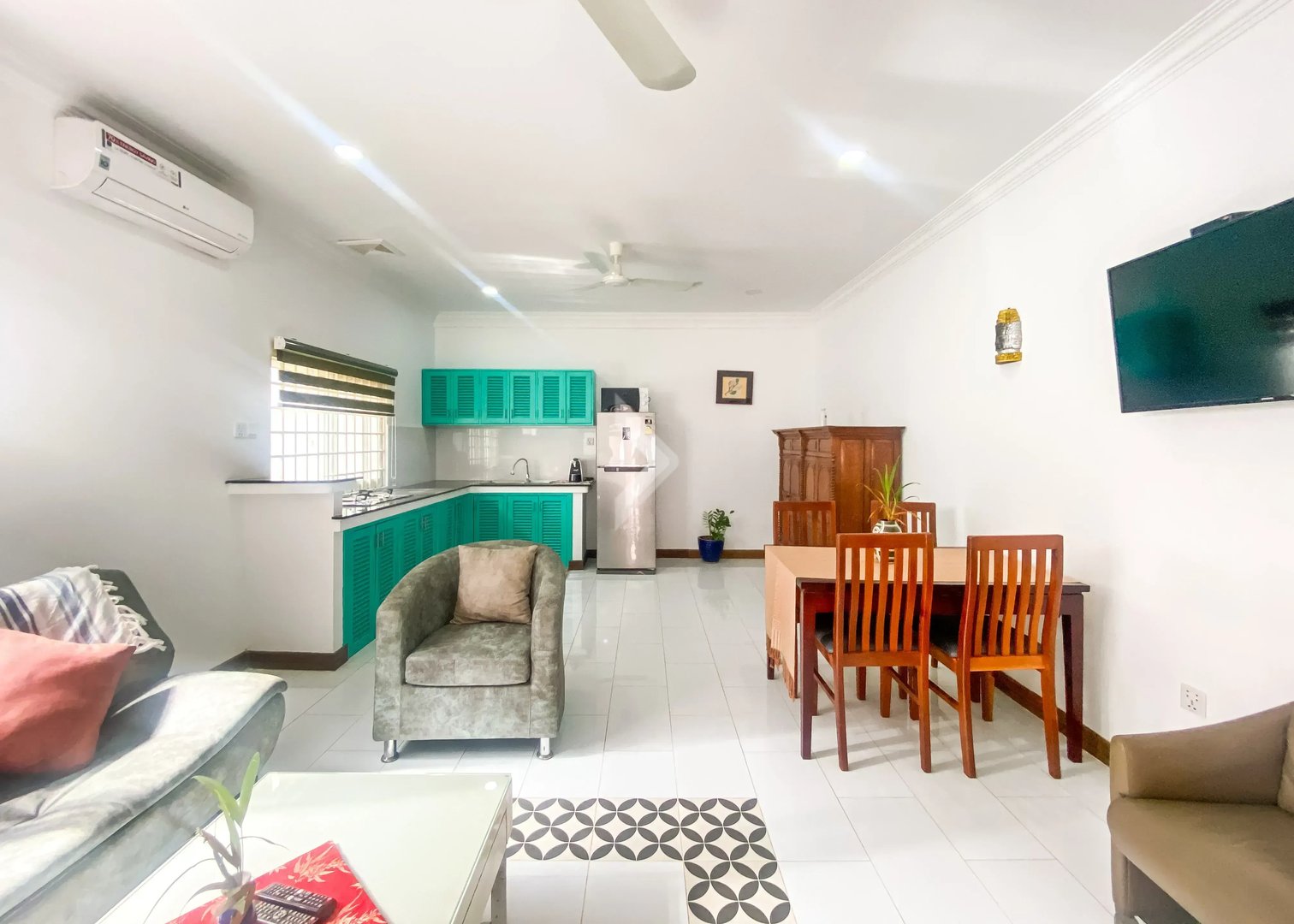 Amenities includes free Wi-Fi, an equipped kitchen, fridge, TV.