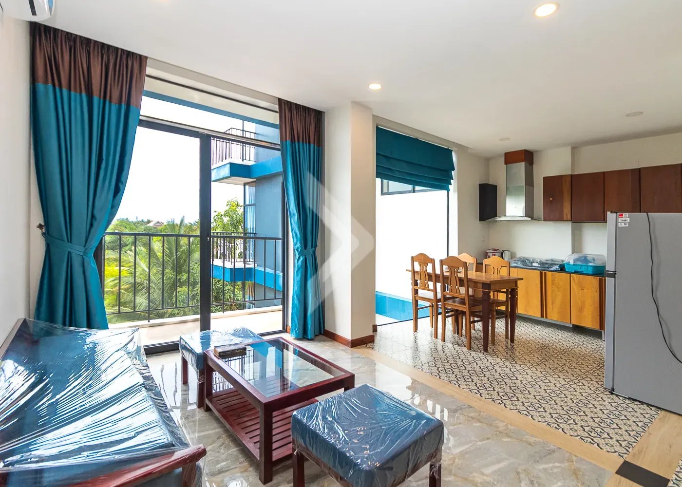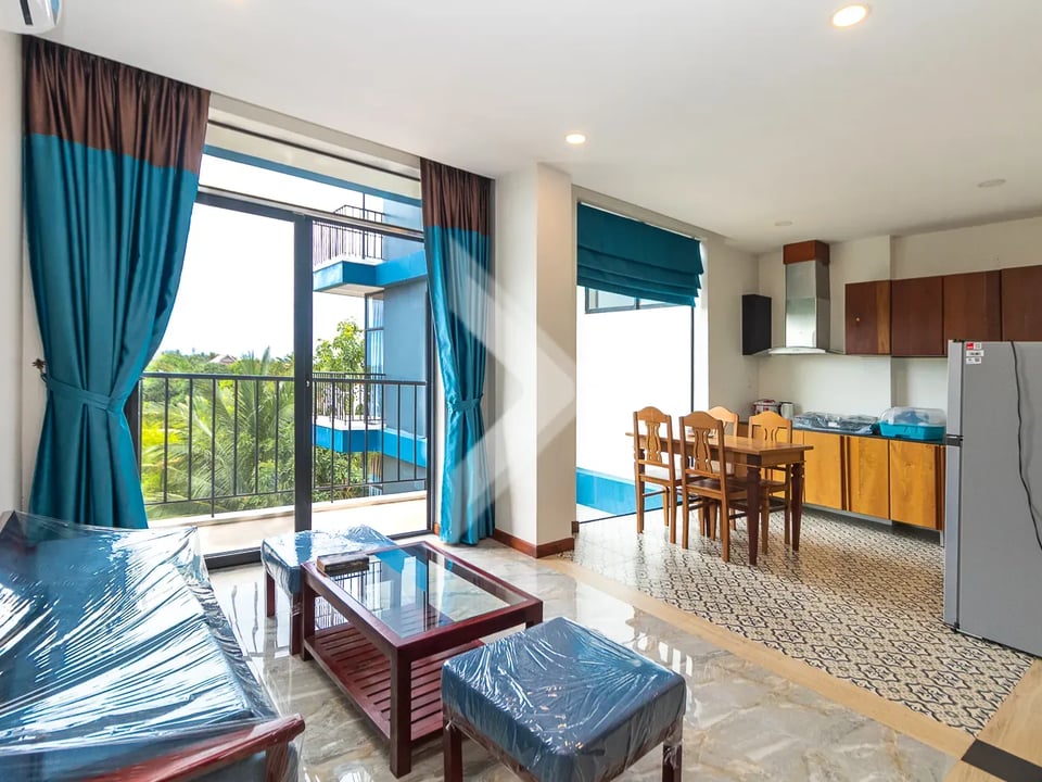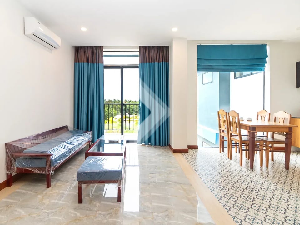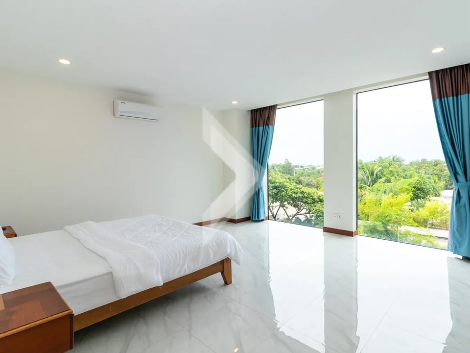 This 83 sqm apartment is highlighted by the amazing view and the living space is very bright all day long. The location is really something unique as well because it is a very quiet area, but just 8 mins from Leu Market, and 9 mins to Pub Street and old market. Many shops, good restaurants, and a large market hall surround the square, so life is this area is extremely convenient.