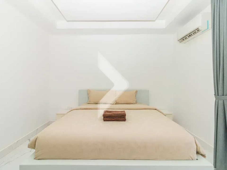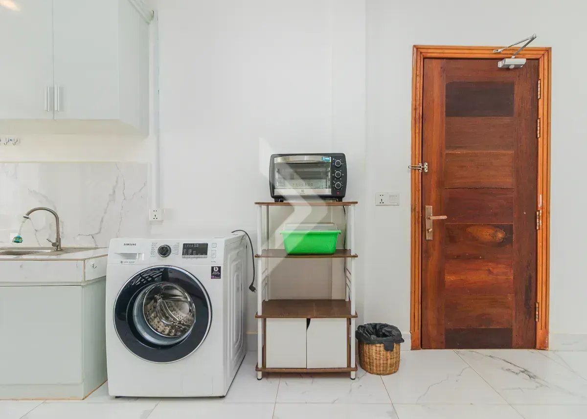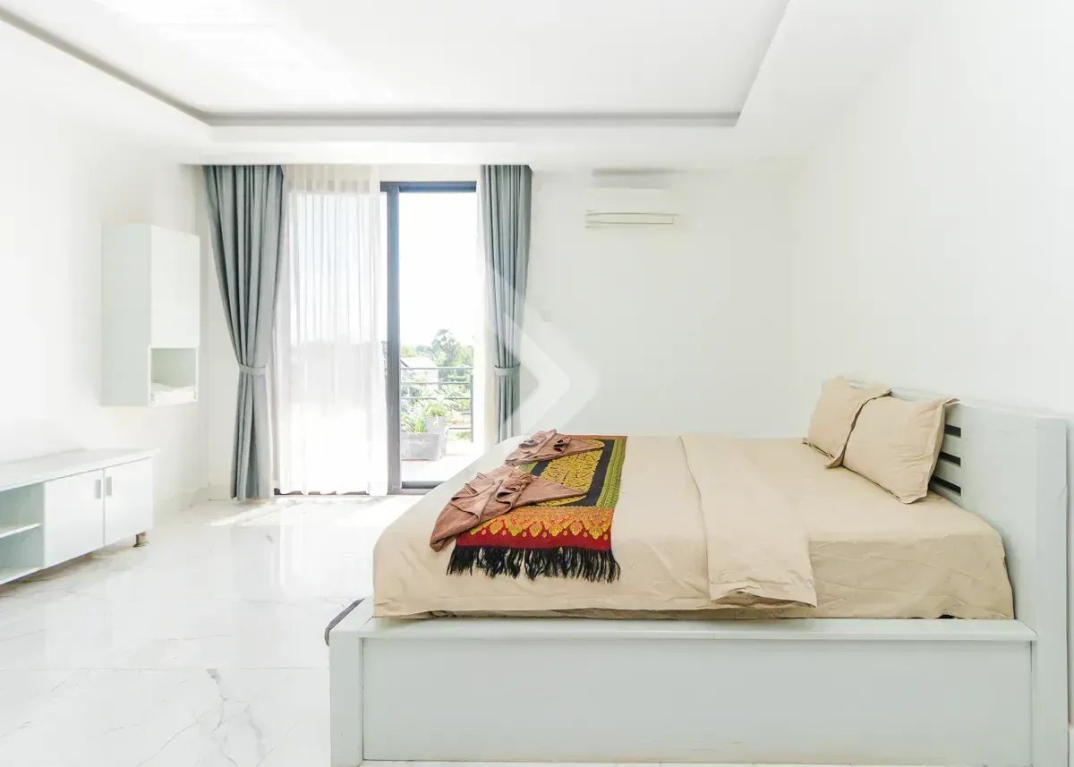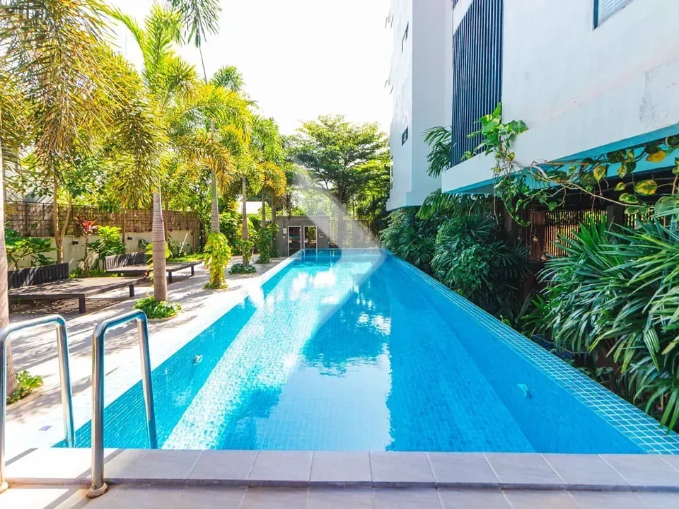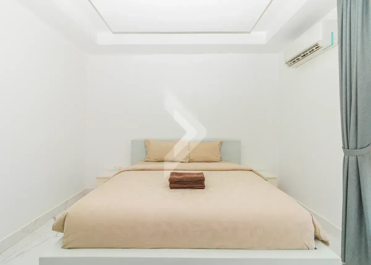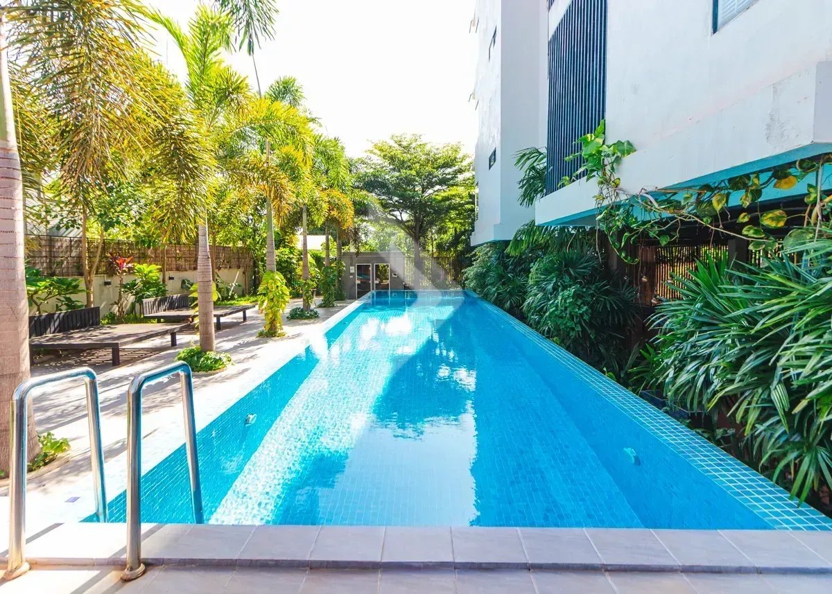 This two-bedroom apartment is in a modern building on a quiet street in the Svay Dangkum area. It has 75 sqm of interior space and a balcony to enjoy. From the balcony, you can see the great view, and faces the quiet street. The bedrooms are very bright, and the kitchen is fully equipped. The building itself rests on a beautiful, Swimming pool which is shared by the residential owners. There is a garage space located in the building as well.