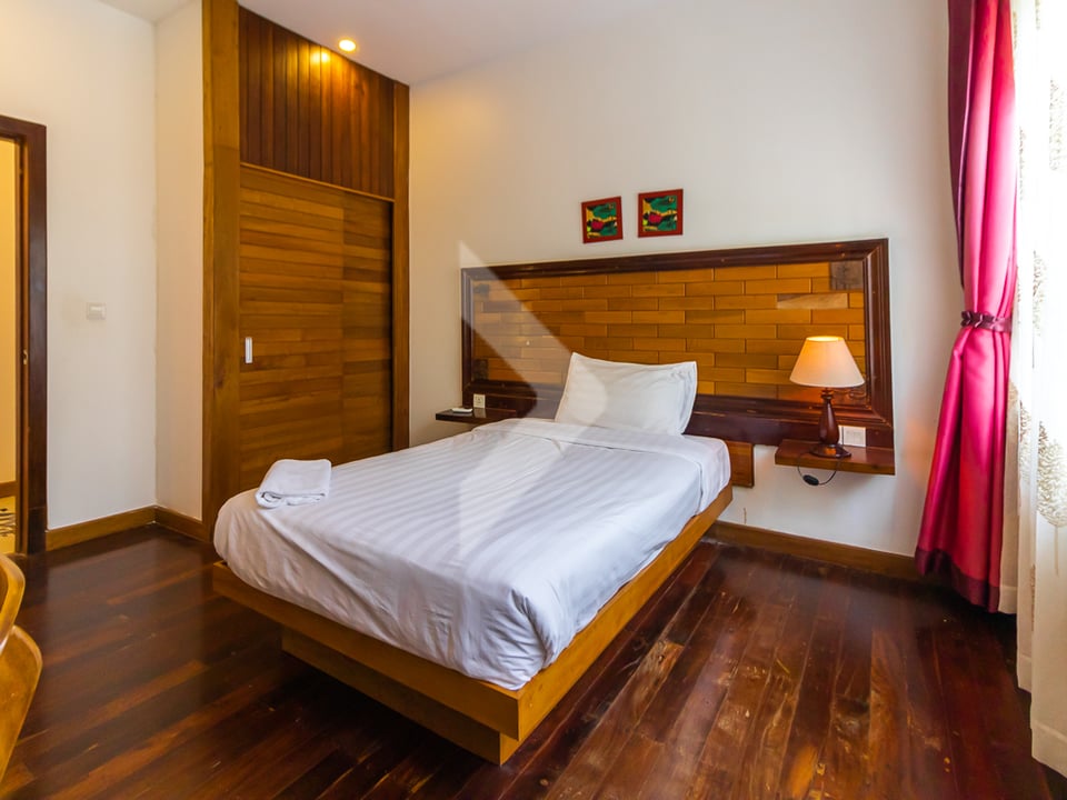 This 2-bedroom apartment is available for rent in the quiet Svay Dangkum area of Siem Reap. It’s a great option for anyone looking for a comfortable and affordable place to live, with the added bonus of a swimming pool. The living room is spacious and comfortable, perfect for relaxing or spending time with friends or family. Both bedrooms are cozy, bright, and come with furniture and storage space. The bathroom is clean and modern with all the essentials. The kitchen includes a stove, refrigerator, and enough space to cook your meals. Enjoy a shared pool, ideal for relaxing or cooling off on hot days. he apartment is located in Svay Dangkum, close to shops, restaurants, and public transportation. It’s also just a short drive to Siem Reap’s city center and the Angkor temples.