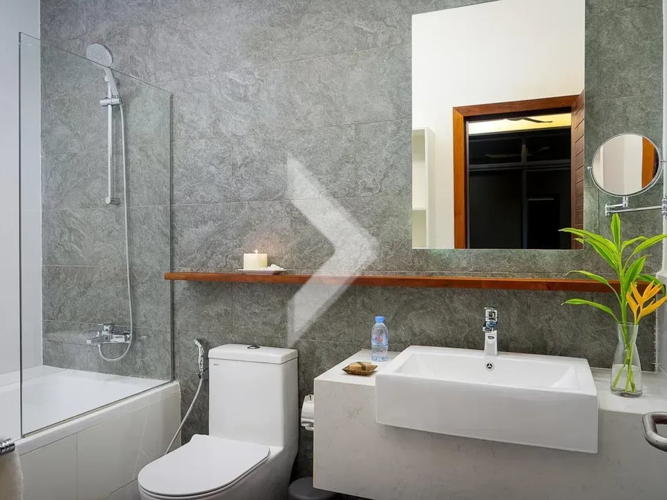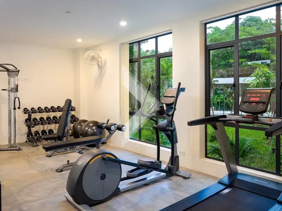 Upon entering, you are greeted by a spacious living area elegantly furnished with contemporary décor and premium finishes. The open-plan layout seamlessly integrates the living room with a fully equipped kitchen. One of the highlights of this apartment is its access to a private pool, perfect for unwinding after a day of exploring Siem Reap's cultural treasures. Residents also enjoy exclusive access to a well-equipped fitness center, ensuring a balanced lifestyle.