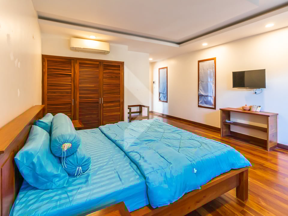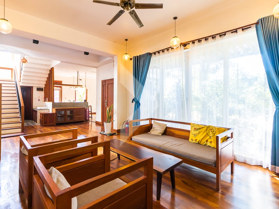 The villa features three large, well-appointed bedrooms, each furnished with high-quality furniture and ample storage space. It offers a spacious, open plan living and dining area, perfect for entertaining guests or relaxing in comfort. The villa comes fully furnished with high-quality, comfortable furniture, including beds, sofas, dining tables, and storage units. The stylish décor blends modern comforts with traditional Cambodian touches, creating a warm and inviting home.