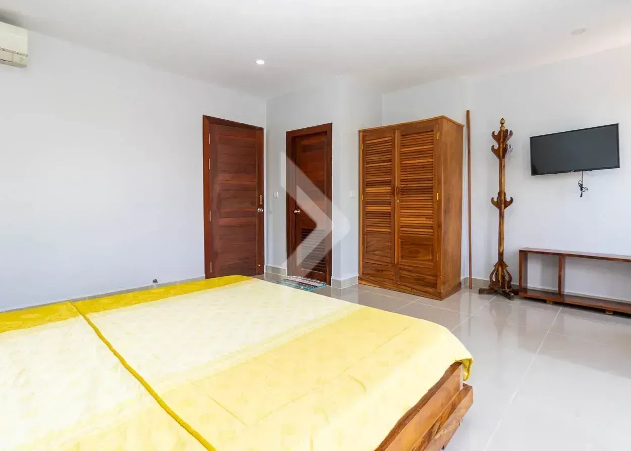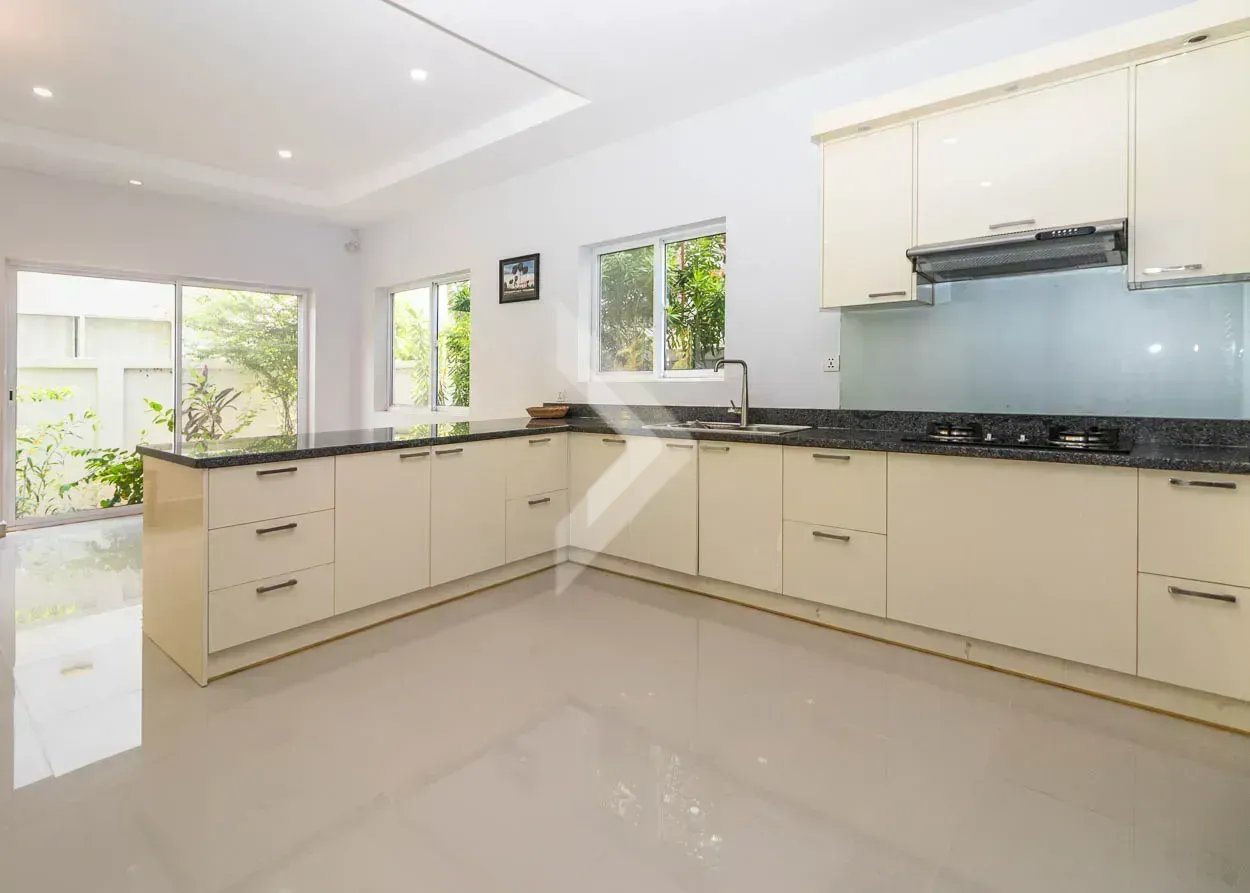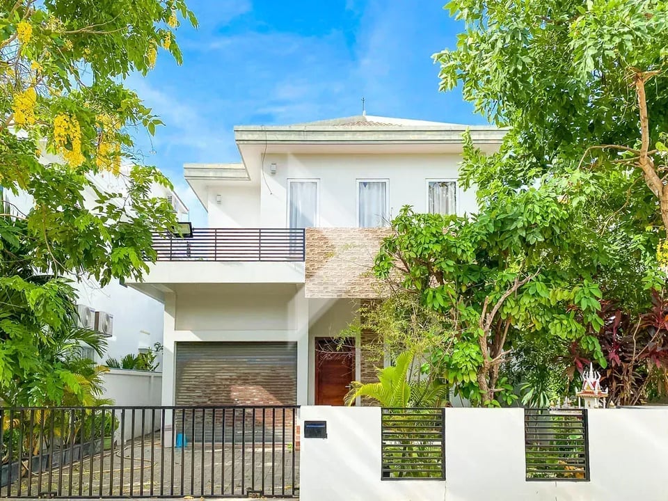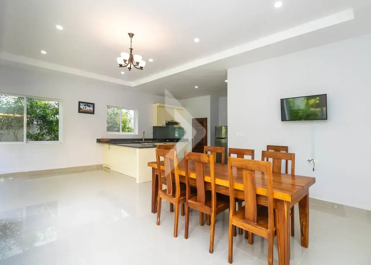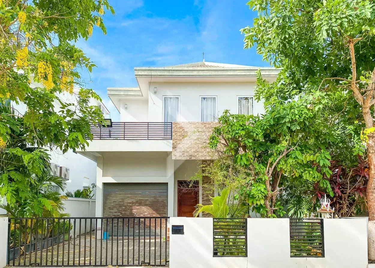 This modern bright 3 Bedroom, 4 Bathroom detached home, located in Sra Nage, Siem Reap, has a huge western style open plan kitchen, living and dining area, perfect for entertaining your family and friends from the Heart of the Home. Each room is fitted with A/C and each Bathroom has Hot & Cool water included, has a separate Laundry Room Inc. washing machine, plus off-road parking for 2 to 3 cars and garage for more storage or a 4th car!