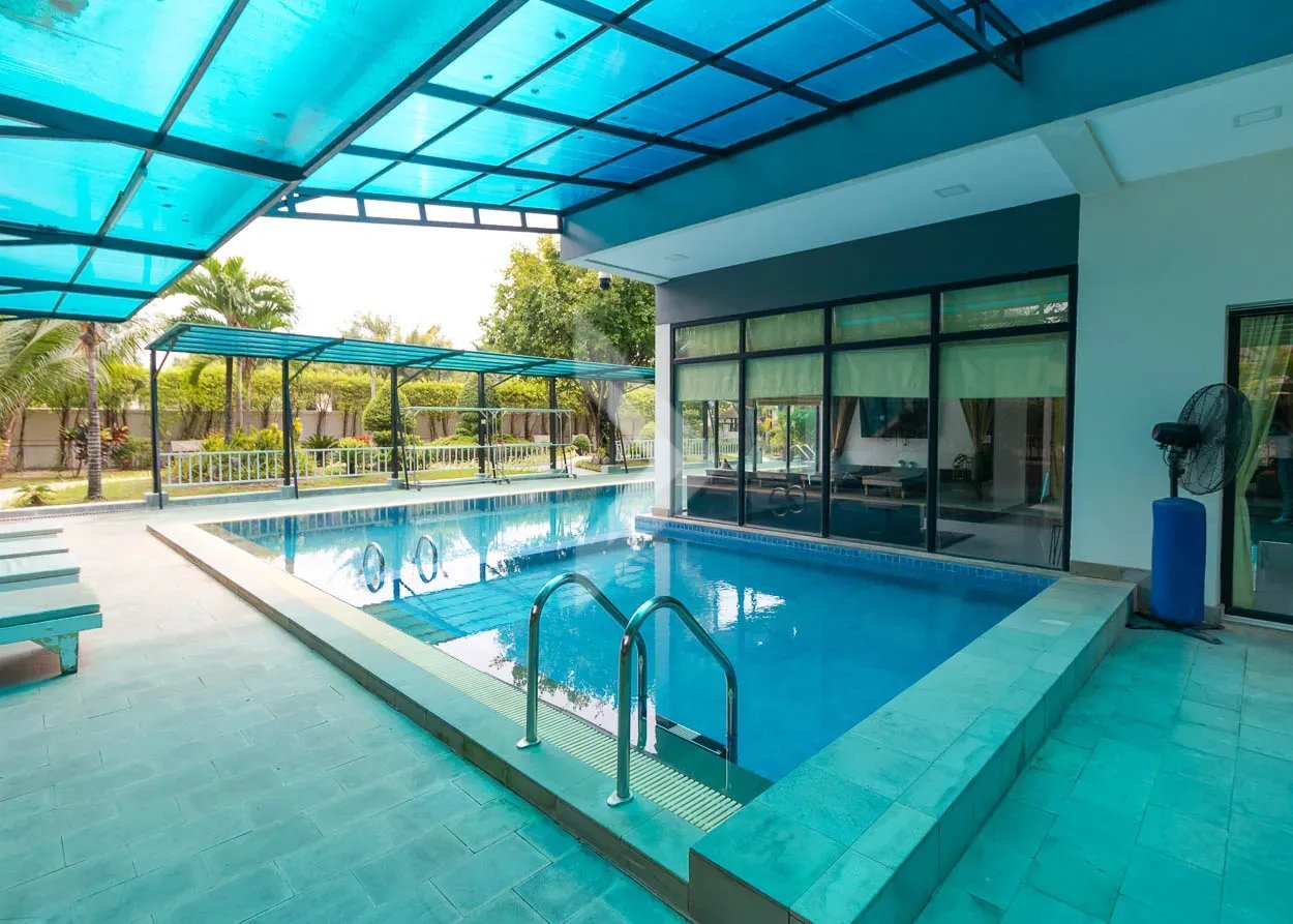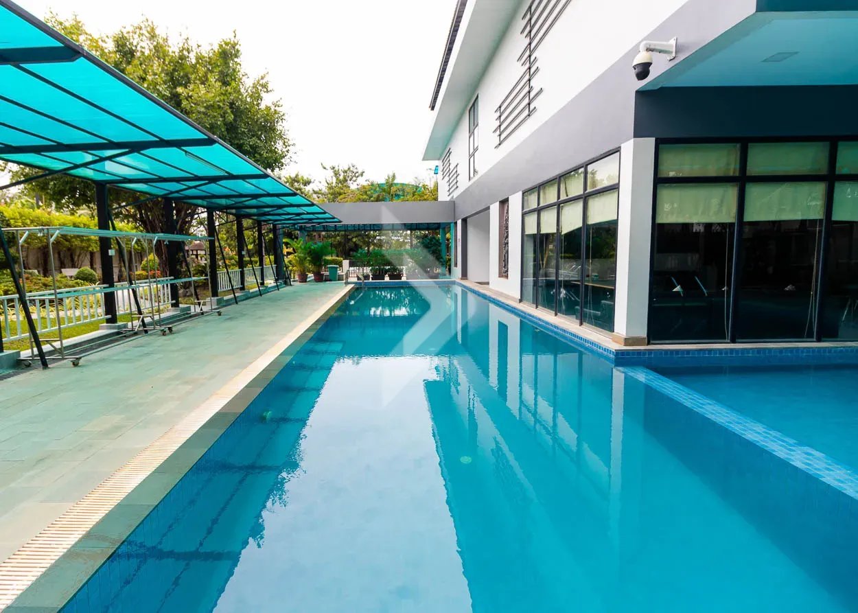 Private swimming pool surrounded by a lush garden, ideal for relaxation and leisure, Landscaped gardens, outdoor lounge areas, and a covered terrace, offering the perfect setting for outdoor entertaining and tranquil moments.