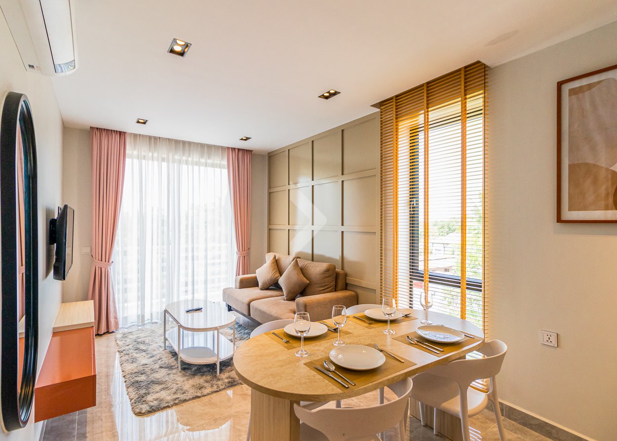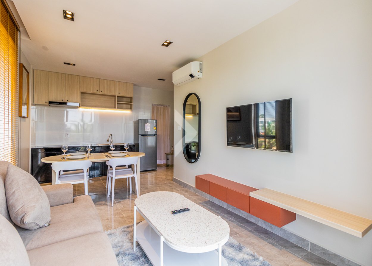 A cozy 1-bedroom apartment with a swimming pool is available for rent in the peaceful Sala Kamreuk area of Siem Reap. This modern apartment is fully furnished and offers a comfortable living space, perfect for singles or couples. It features a spacious bedroom, a bright living area, a well-equipped kitchen, and a private bathroom. Residents can enjoy access to a shared swimming pool, creating a relaxing environment. The location is quiet yet convenient, just a short drive from the city center, markets, restaurants, and other amenities. Ideal for those looking for a comfortable and hassle-free living experience in Siem Reap.