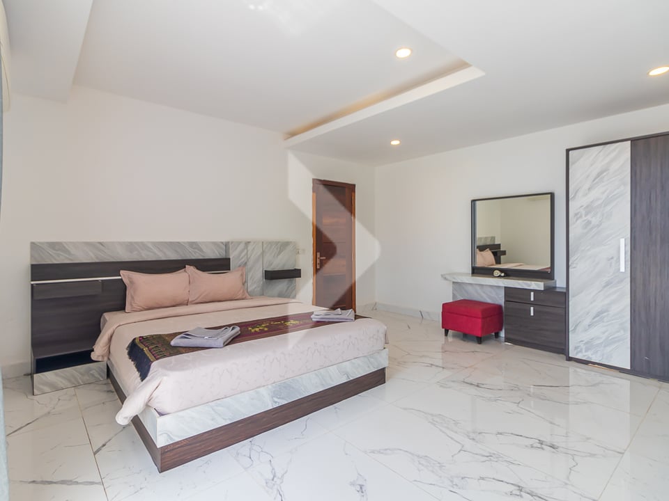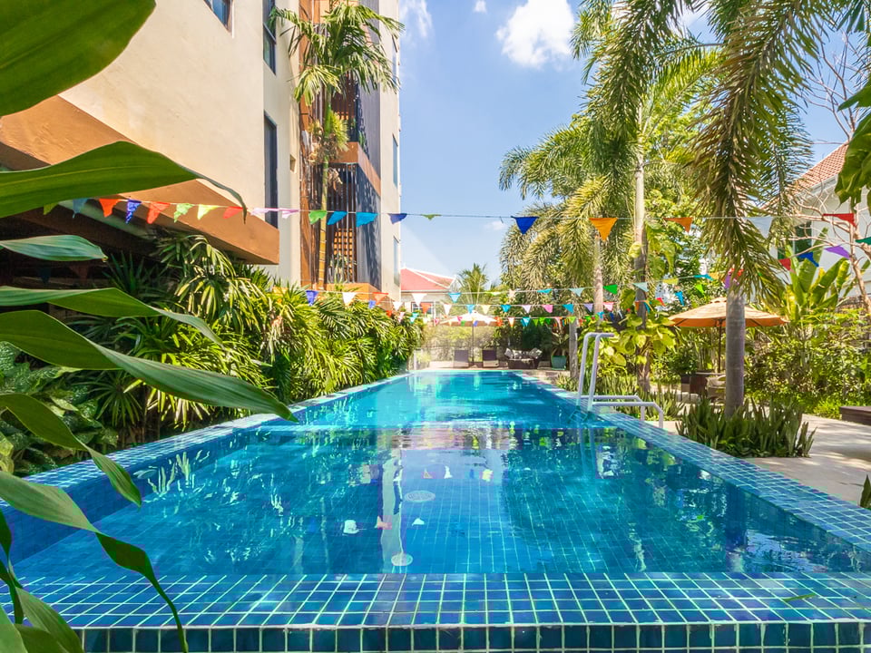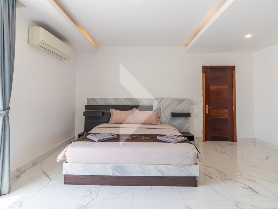 This 3-bedroom apartment with a private pool is available for rent in Siem Reap. It’s located in a quiet and safe area, not far from the city center and Angkor Wat. The house is fully furnished and ready to move in. Each bedroom has air conditioning and its own bathroom. The living room, dining area, and kitchen are open and spacious—great for relaxing or spending time with family and friends. Outside, there’s a private swimming pool and a small garden where you can enjoy the fresh air. This home is perfect for families or anyone looking for a comfortable place to live in Siem Reap.