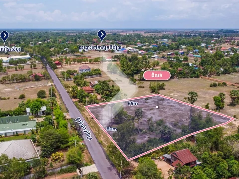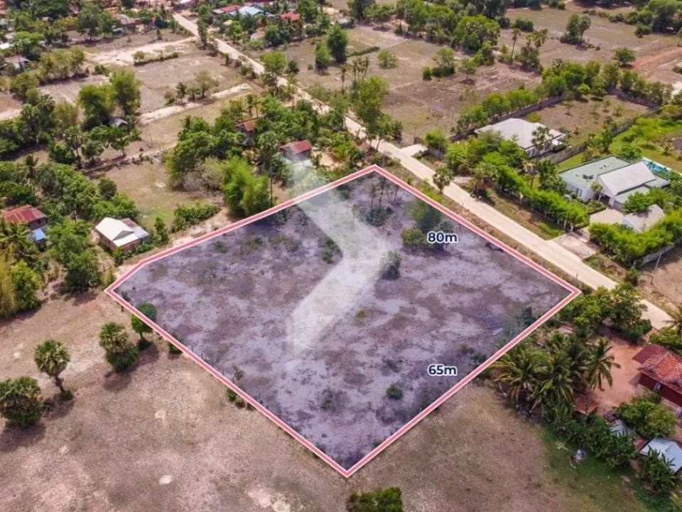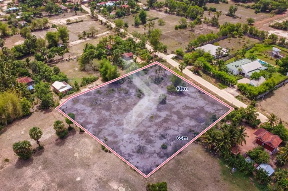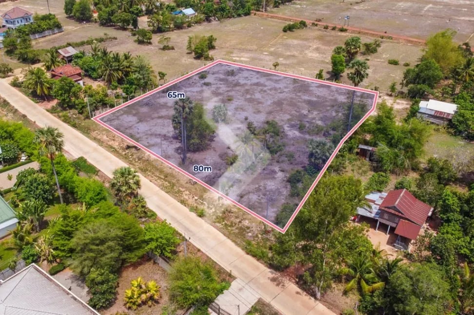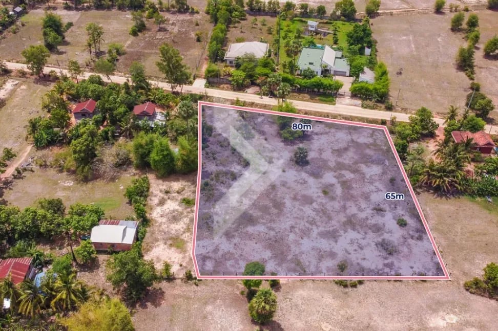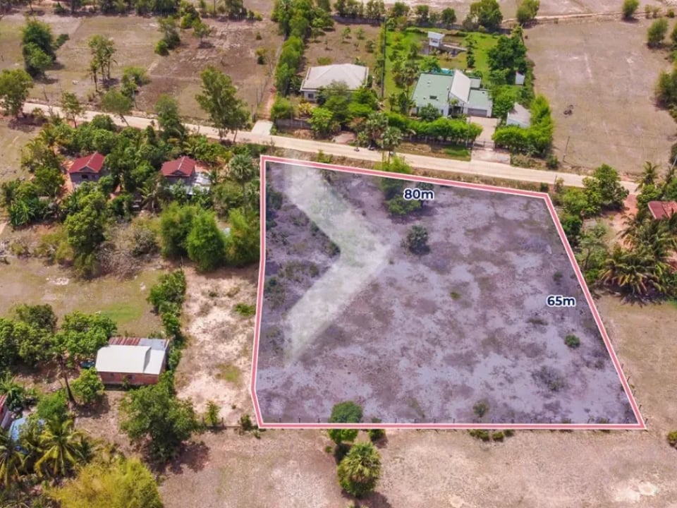 For sale in Sam Bour, Siem Reap, is a prime plot of land measuring 80 meters by 65 meters, totaling 5,453 square meters. This expansive property is easily accessible via a 22-meter-wide concrete road, providing reliable and convenient access. The land’s size and location make it ideal for a range of uses, from residential developments and commercial ventures to agricultural projects or investment opportunities. Its positioning in a developing area of Siem Reap offers significant potential for future growth, making it a valuable addition to any property portfolio. With ample space and excellent road connectivity, this land provides a solid foundation for your next venture.