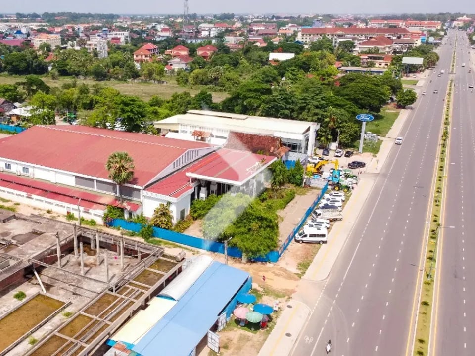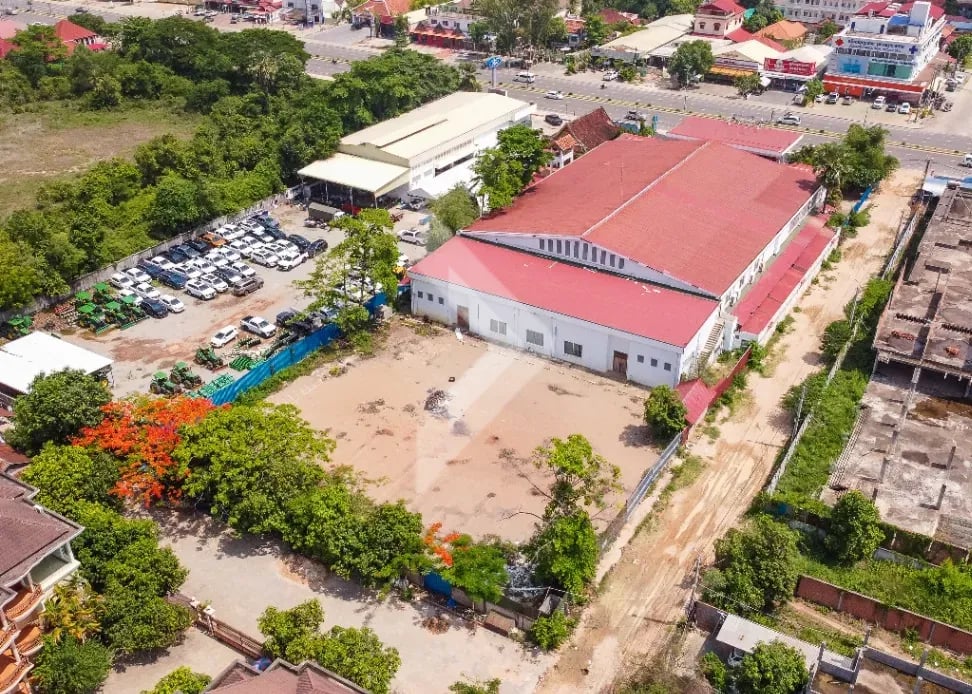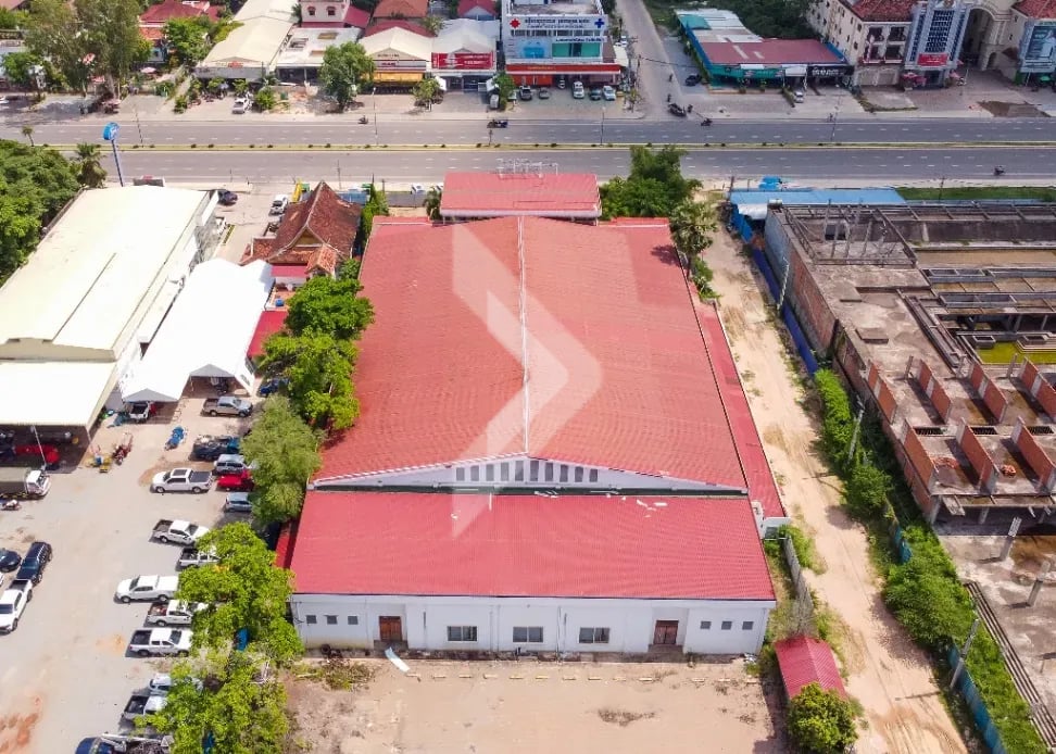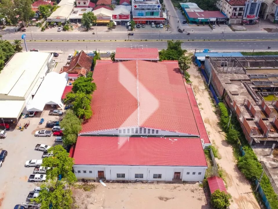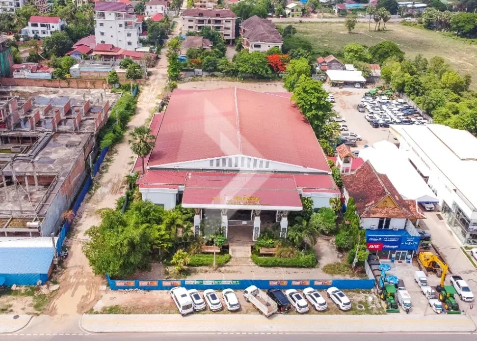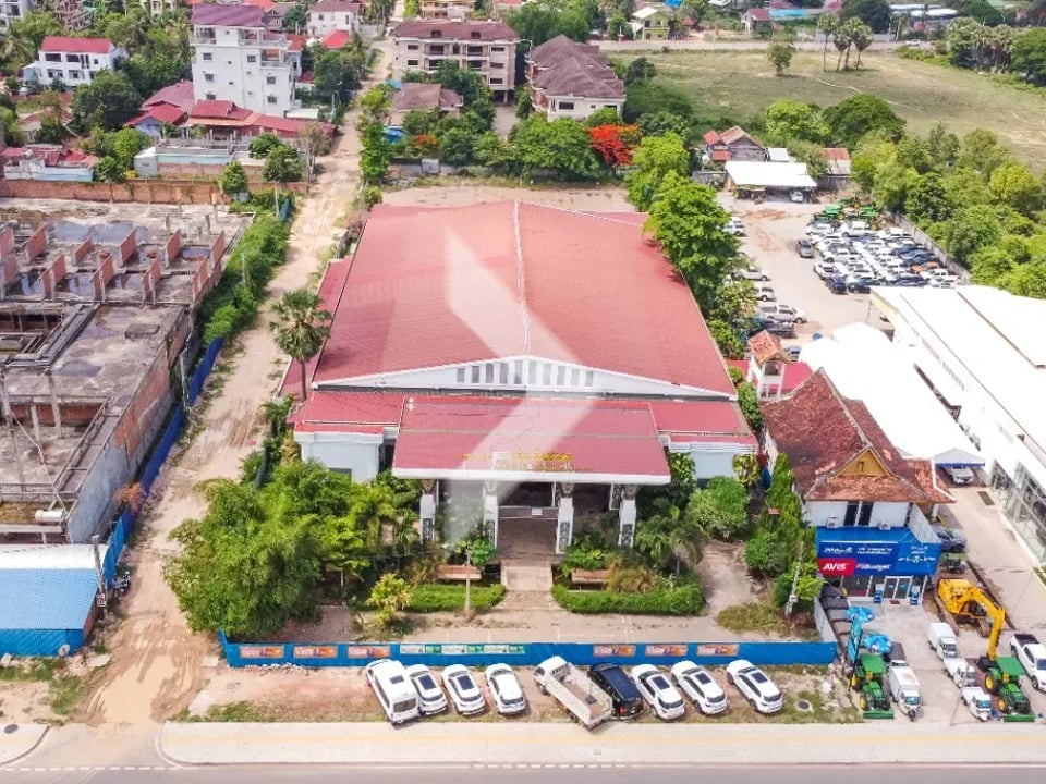 For rent is a commercial space located on National Road 06 in the Svay Dankum area of Siem Reap. The property features 5,825 square meters of land and a building size of 2,880 square meters. Its prime location offers great visibility and easy access, making it perfect for shops, restaurants, or offices. This is a fantastic opportunity for businesses looking to thrive in a busy area with lots of foot traffic.