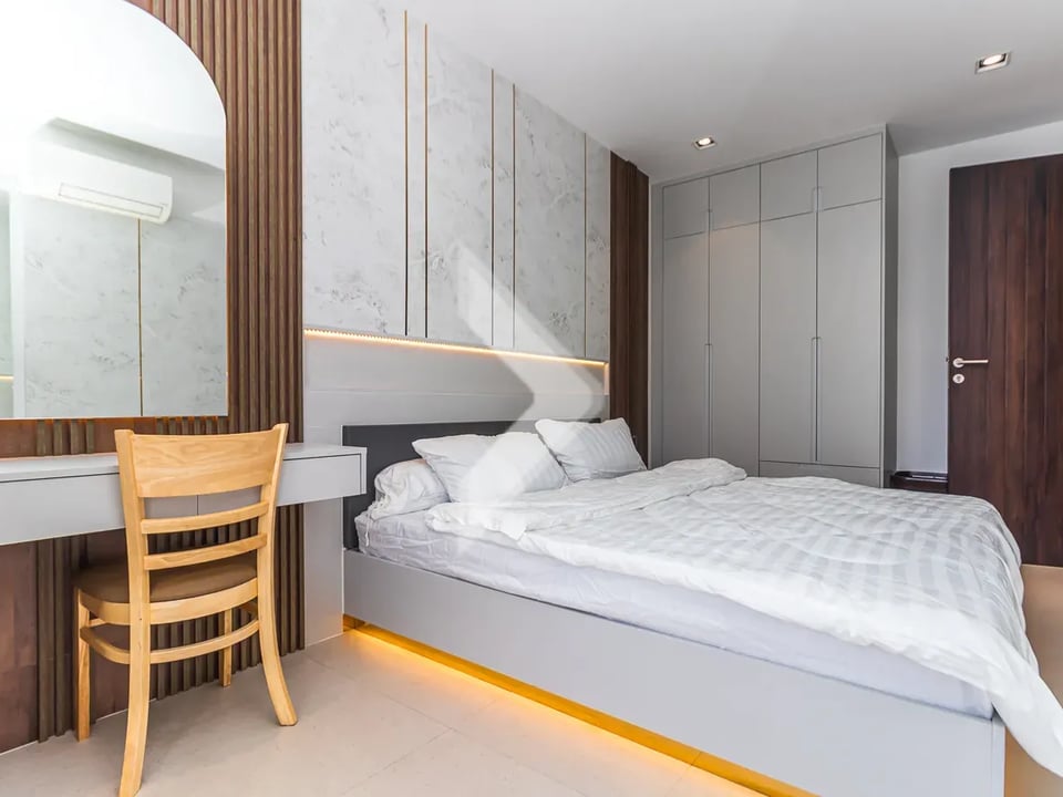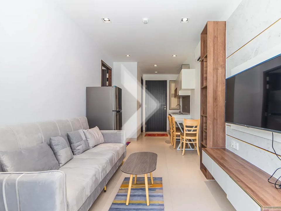 tep into a meticulously designed living space that combines modern aesthetics with thoughtful functionality. The open-plan layout seamlessly connects the living area with a compact yet fully equipped kitchen, featuring sleek countertops, modern appliances, and ample storage space. Large windows flood the interior with natural light, creating a bright and inviting atmosphere. The bedroom is a serene retreat, furnished with a comfortable bed, storage solutions, and air conditioning to ensure a peaceful night's sleep amidst Cambodia's tropical climate.