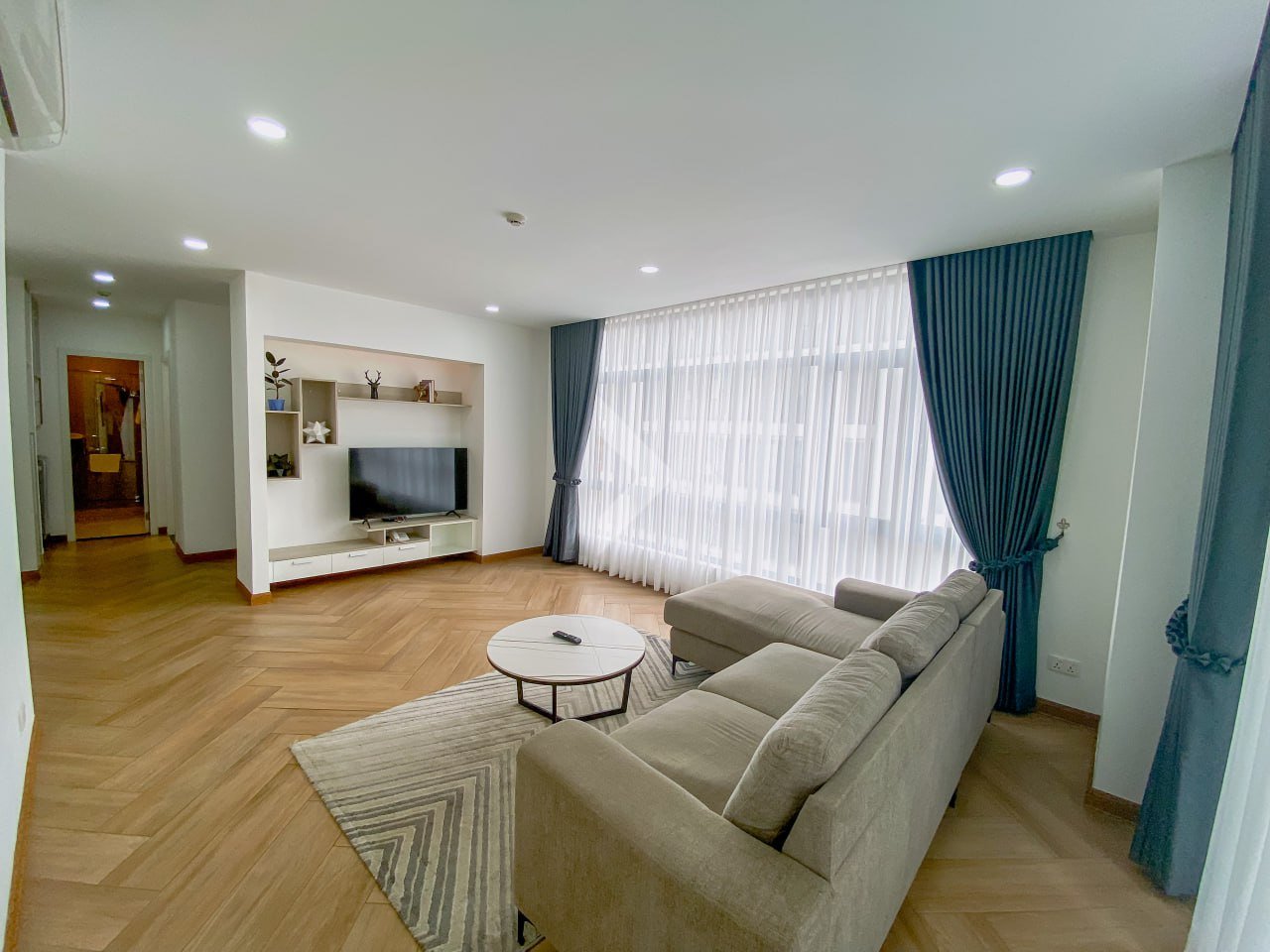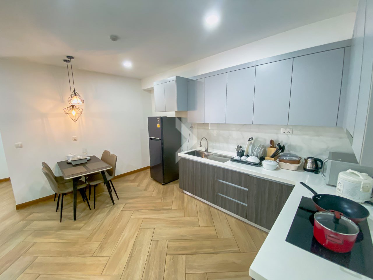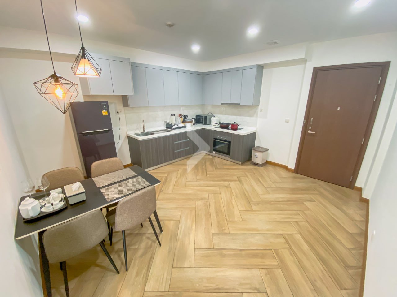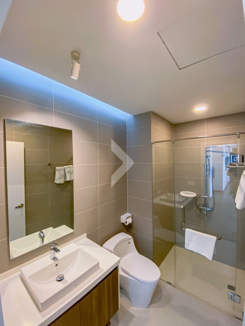 Inside, the apartment features a large and welcoming living area, a modern kitchen with a built-in closet, a digital touch electric stove with oven, microwave, and a stainless steel sink. It also comes fully equipped with a washing machine, refrigerator, smart TV, wireless internet access, and cable TV for your convenience.