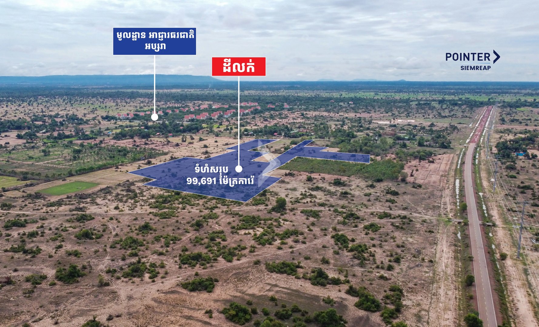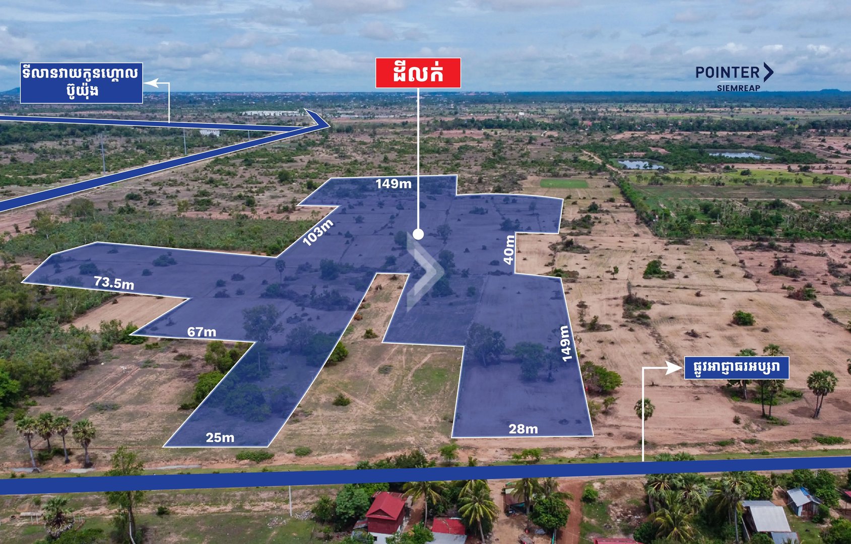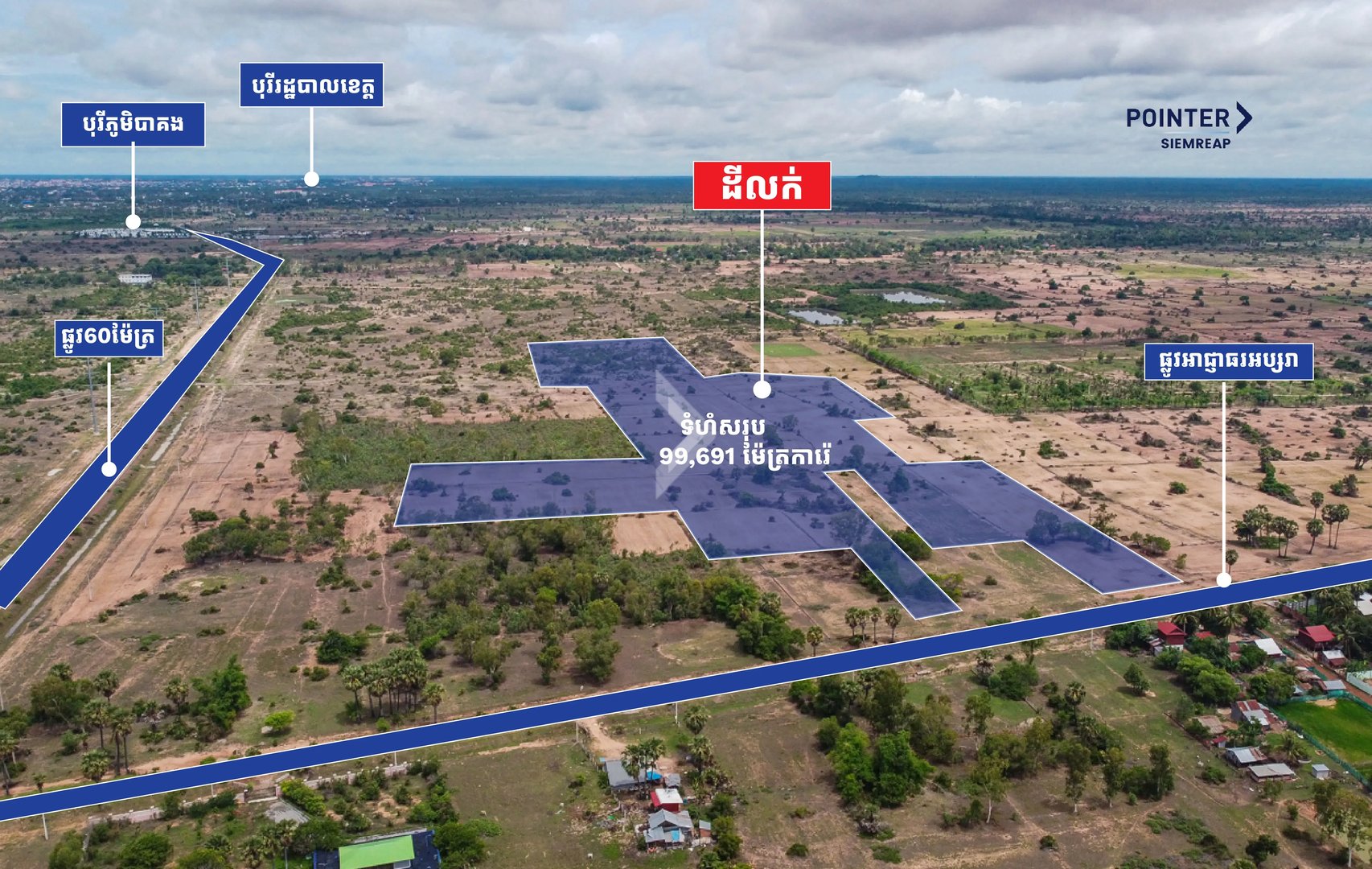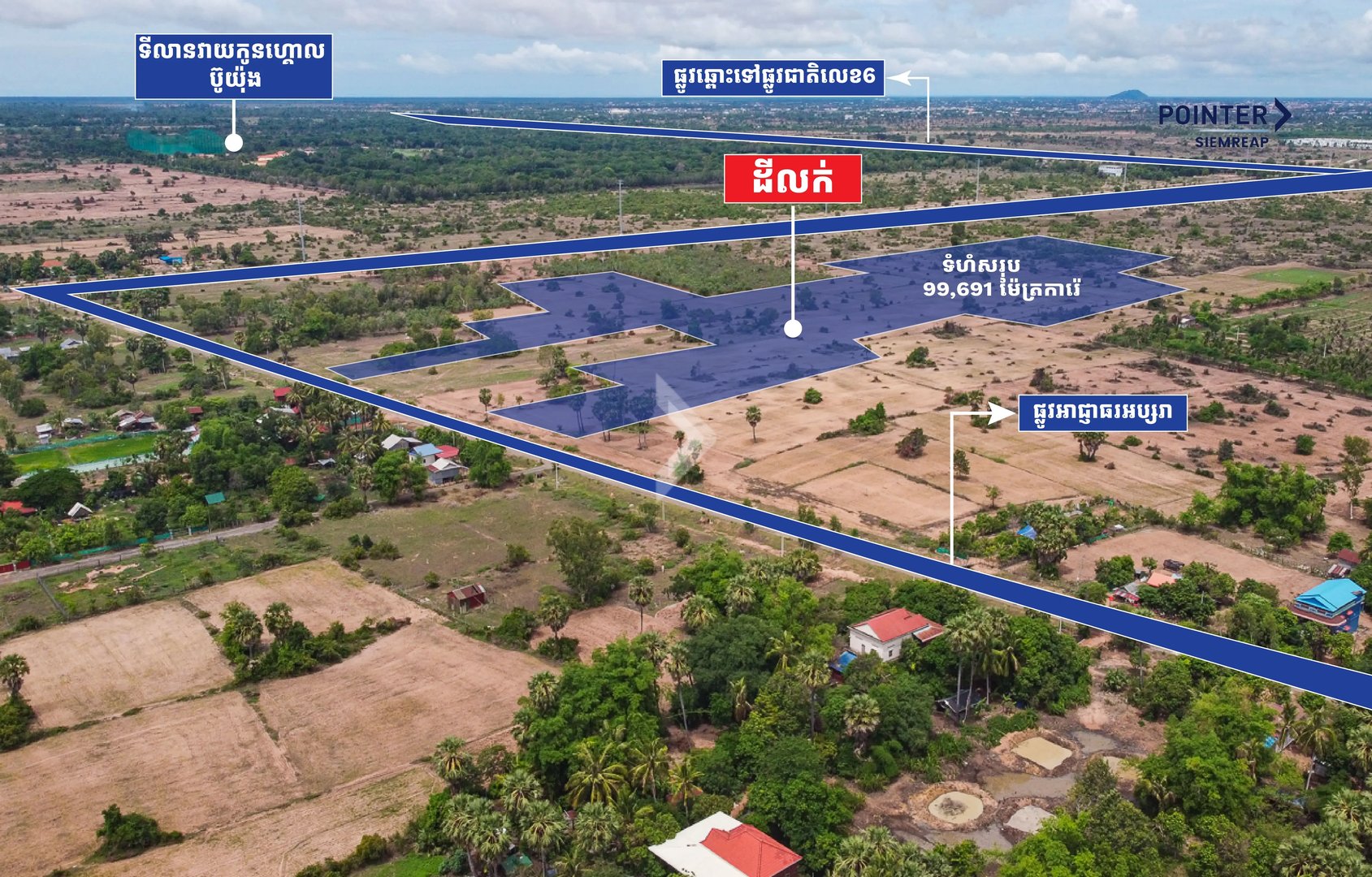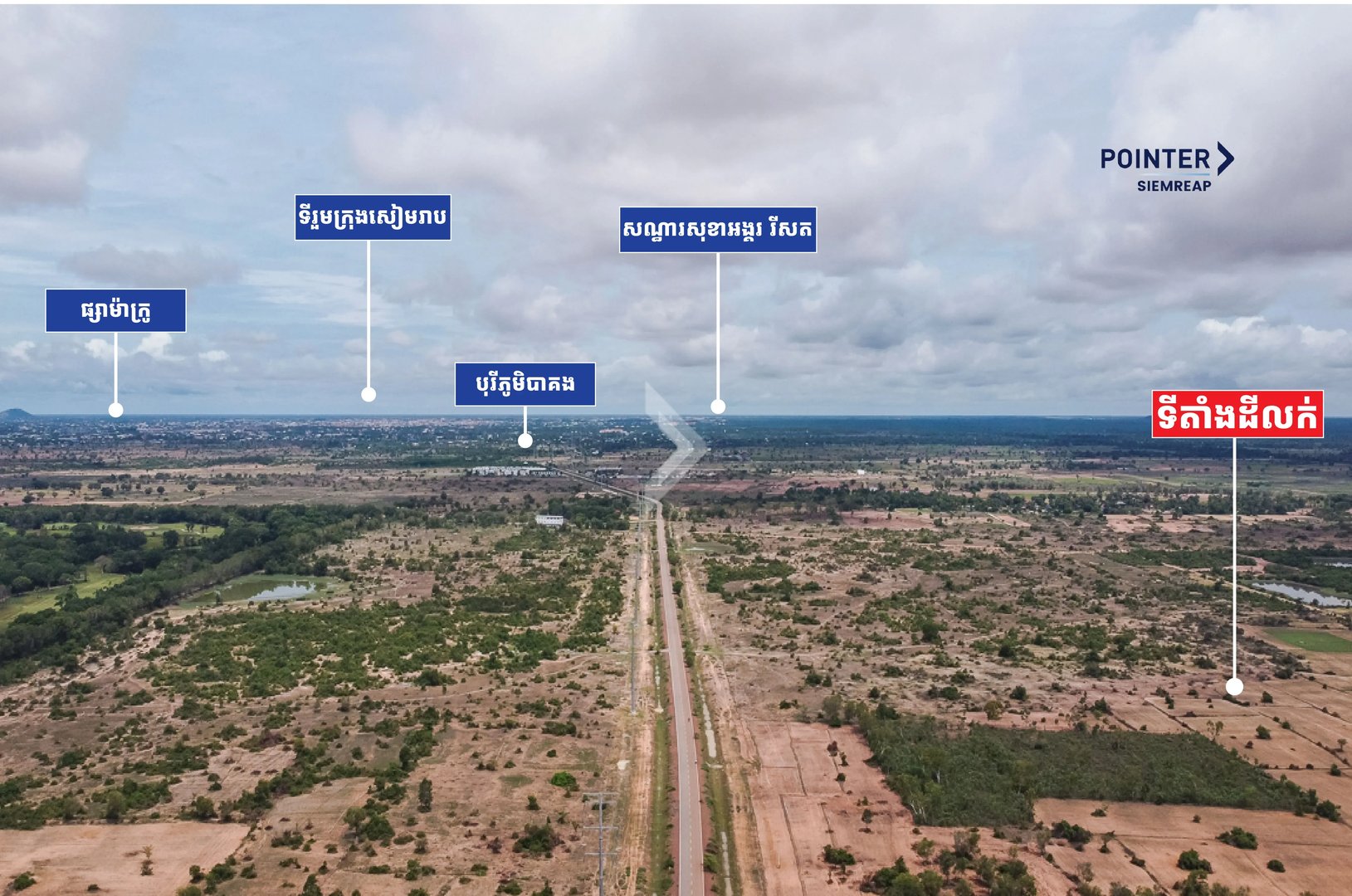 The land is surrounded by a golf club resort, Borey Phum Bakong, the APSARA National Authority office, and other future new projects. It's only 4.8km from National Road 6, 5km from Prey Kuy Roundabout, and a 13-minute drive to Sokha Angkor Resort and Conference Center via 60m Road.