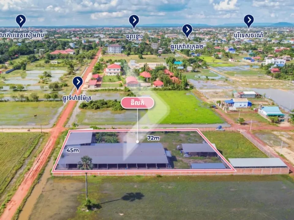 a spacious piece of land in the Chreav area of Siem Reap, measuring 3,315 sqm (45m x 72m). It's located in a vibrant neighborhood with easy access to local market and school, making it a convenient spot for families and businesses alike. Plus, it’s just a short drive from the city center and popular attractions. With its great location and size, this land offers fantastic potential for growth and investment. Don’t miss out on this opportunity to secure a valuable property in a developing area.