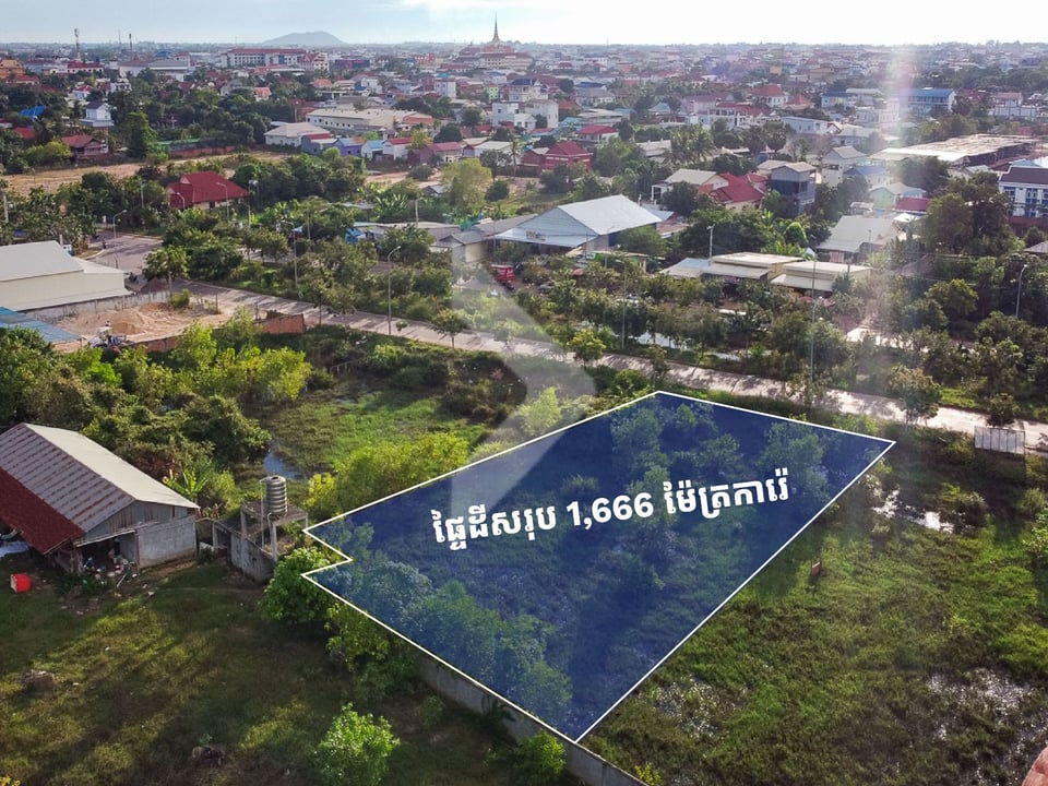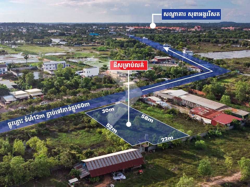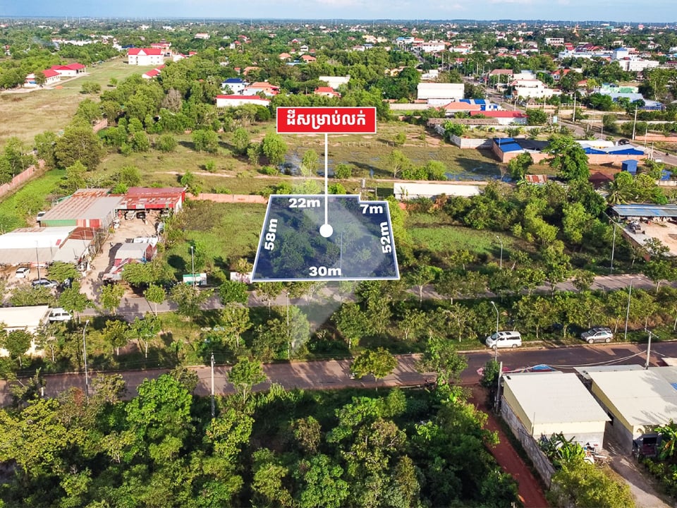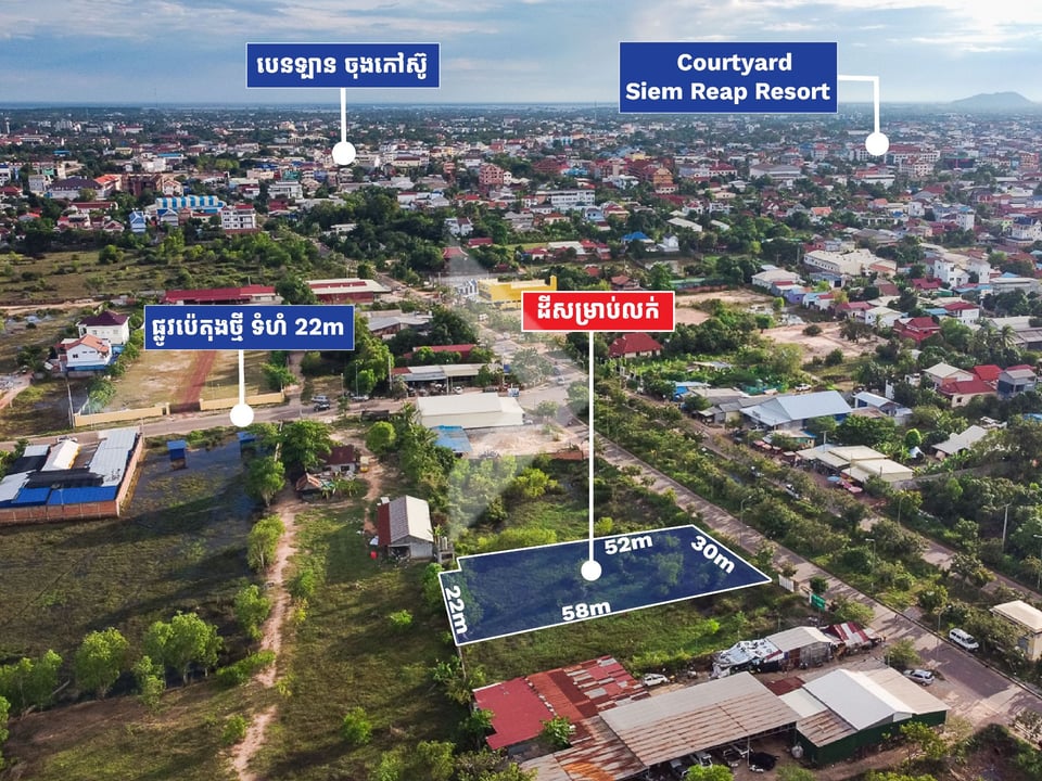 This land for sale comes with a hard title and has a total size of 1,666 sqm (30m x 58m). It is located on the main road connecting the Chung Kavsu Traffic Light to Apsara Road (60m Road), in Tlok Andoung Village, Sla Kram Commune, Siem Reap City, just 4 km from the Royal Residence of Siem Reap. With this prime and convenient location, the land is ideal for opening any type of business, such as big retail, showroom, supermarket, warehouse, or other commercial developments. It offers strong potential for investors looking for a strategic property in a fast-growing area.
