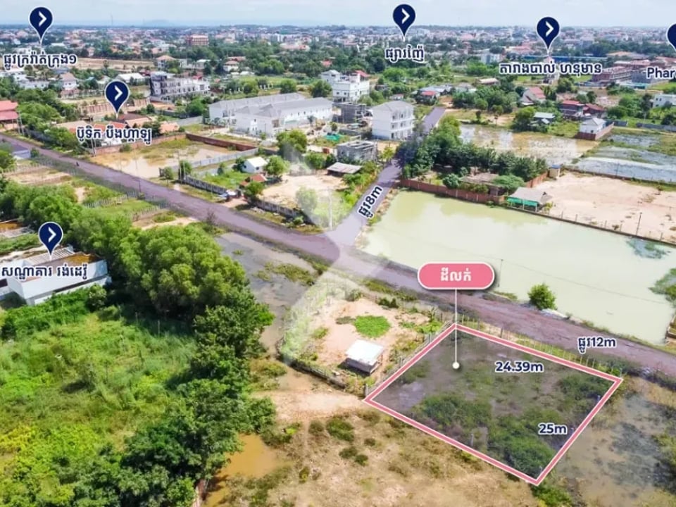 Unlock the potential of this exceptional 25m x 25m land parcel located in the highly sought-after Svay Dankum area. Perfectly positioned in a vibrant neighborhood surrounded by upscale resorts and local development projects, this plot offers a unique opportunity for investment or development. The land is located along 8m Road only 5 minutes from Sok San Road and Pub Street, surrounding by many lands with the building, Holiday Home and resort.