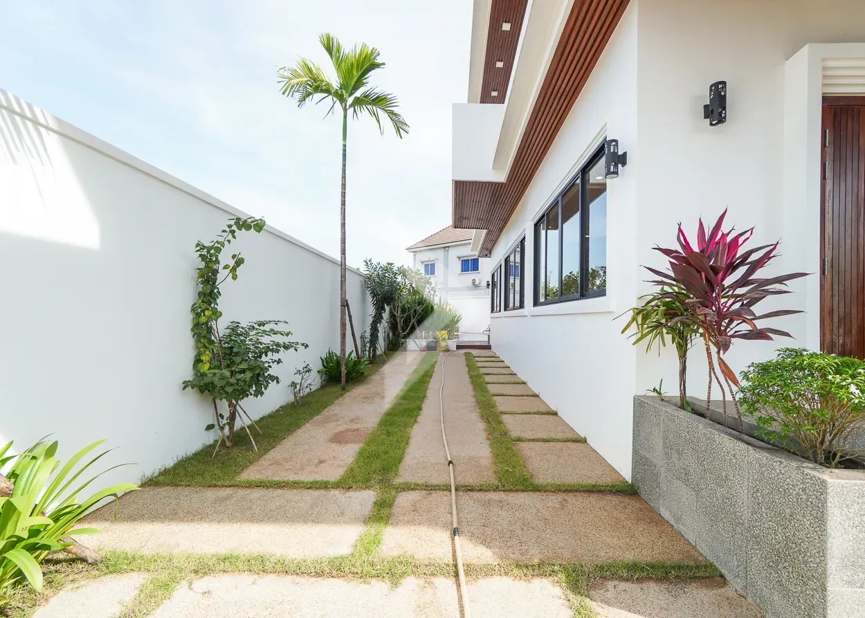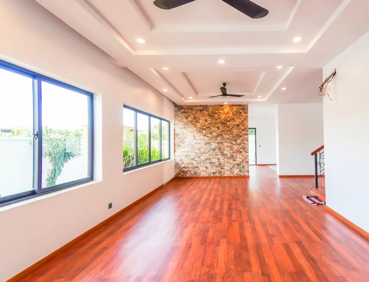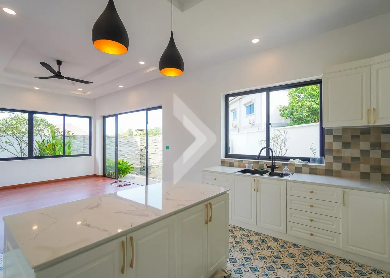 This Beautiful Villa has Four (4) Bedrooms and Five (5) Bathrooms, 2) Big Space of Living rooms per each floor, Kitchen and Dining area is located at the Back of Villa with Swimming Pool View.
