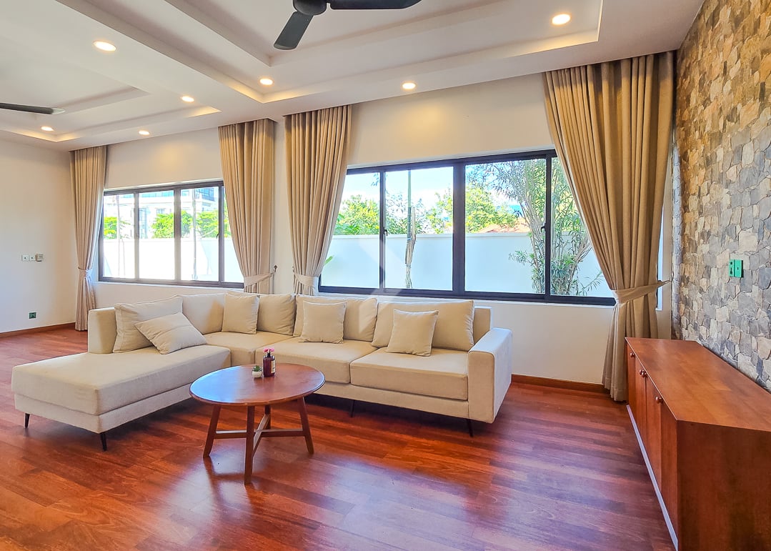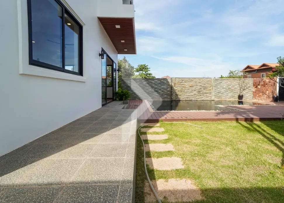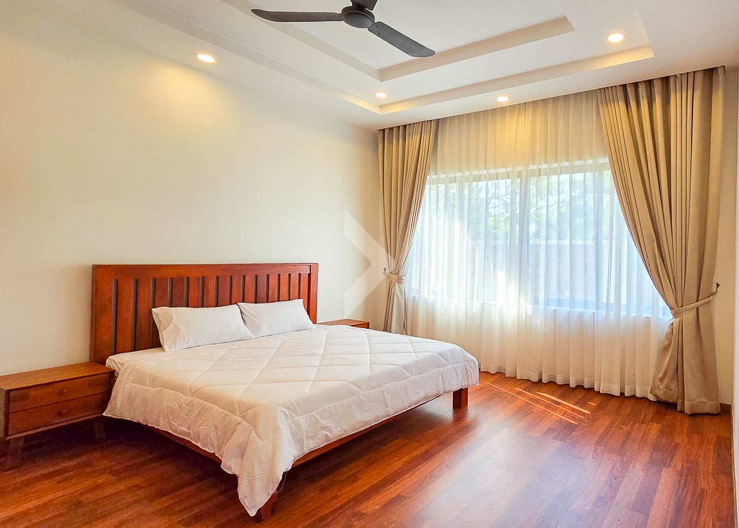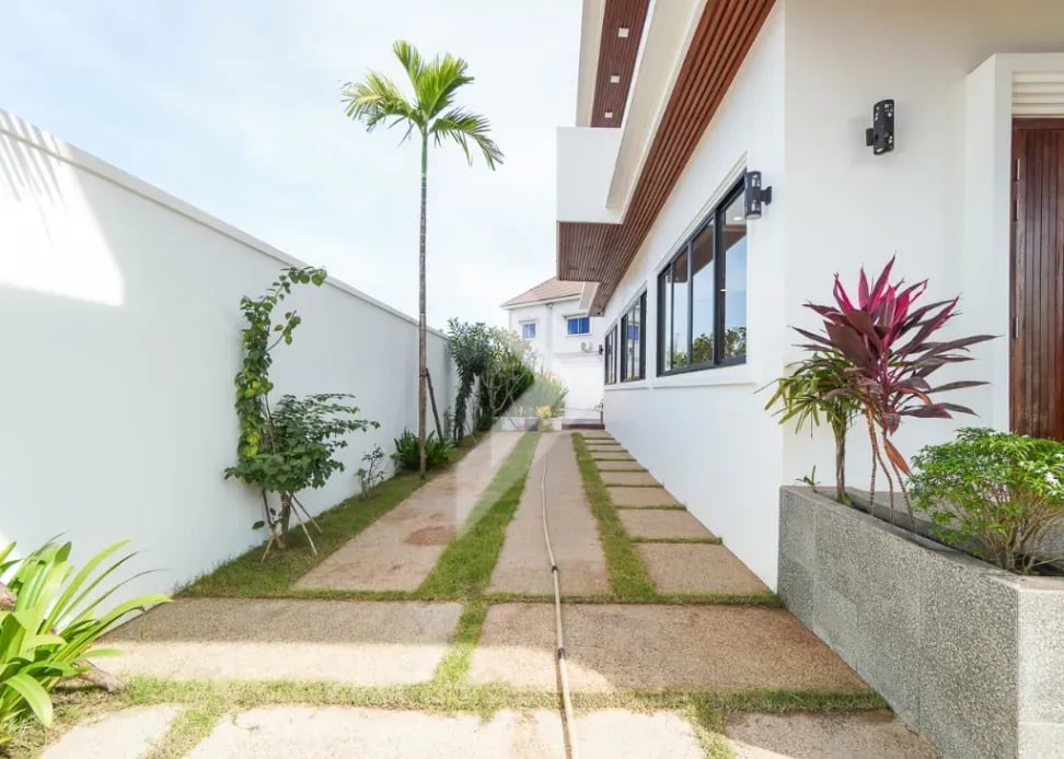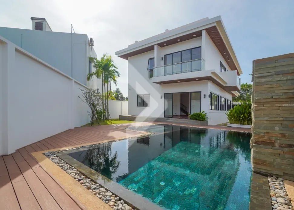 The Modern Villa Located in Svay Dangkum Commune, Siem Reap City, Surrounded by Private Villa, Hotel, Local Market, Pharmacy, only 5 minutes from Sok San Road and 8 minutes' drive to Old Market. This Beautiful Villa has Four (4) Bedrooms and Five (5) Bathrooms, two (2) Big Space of Living rooms per each floor, Kitchen and Dining area is located at the Back of Villa with Swimming Pool View. This Modern Villa has a total land area of 425 square meters, The road in front of the house is a 12-meter concrete road Connect to Wat Chak Pagoda or Ring Road 1.