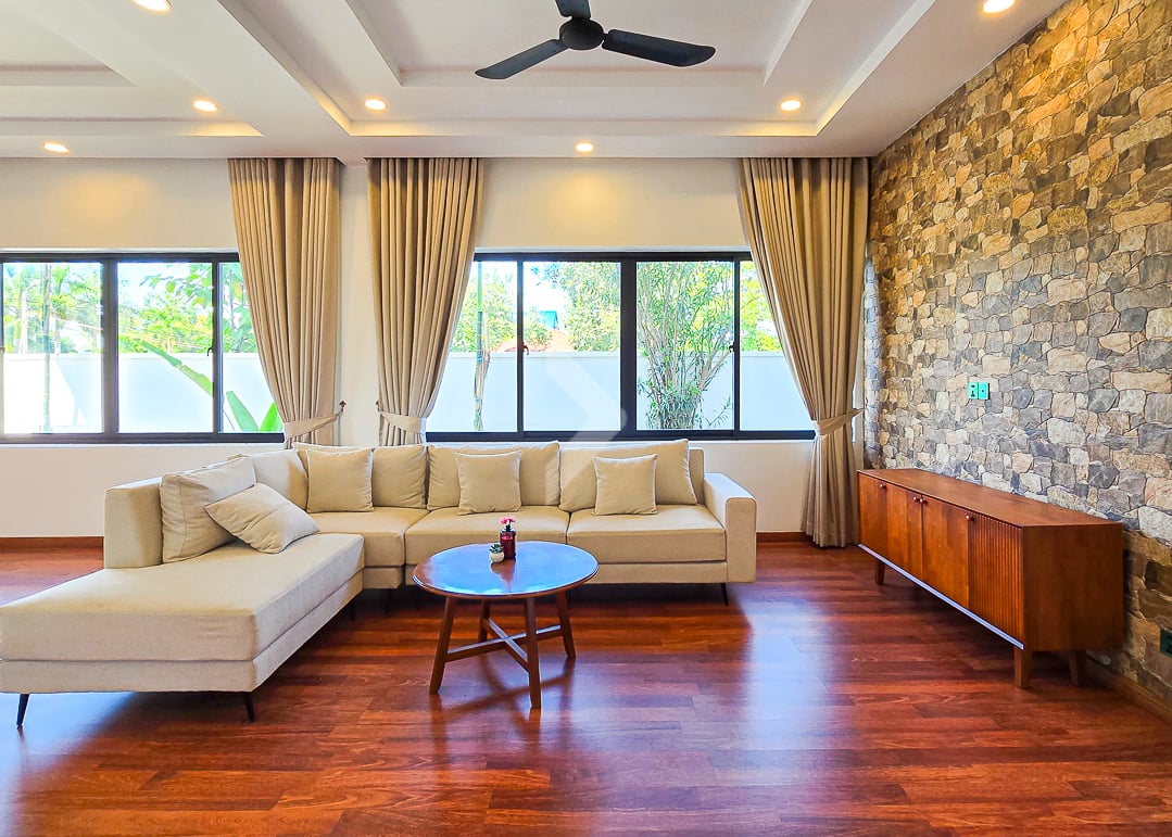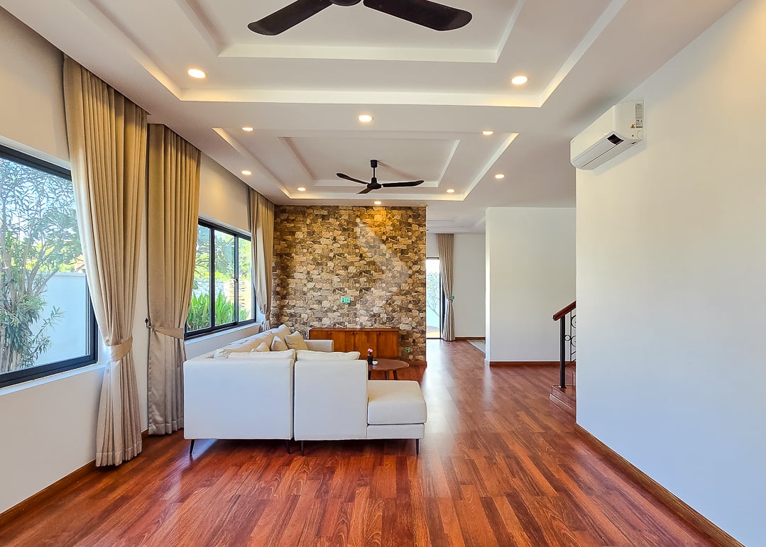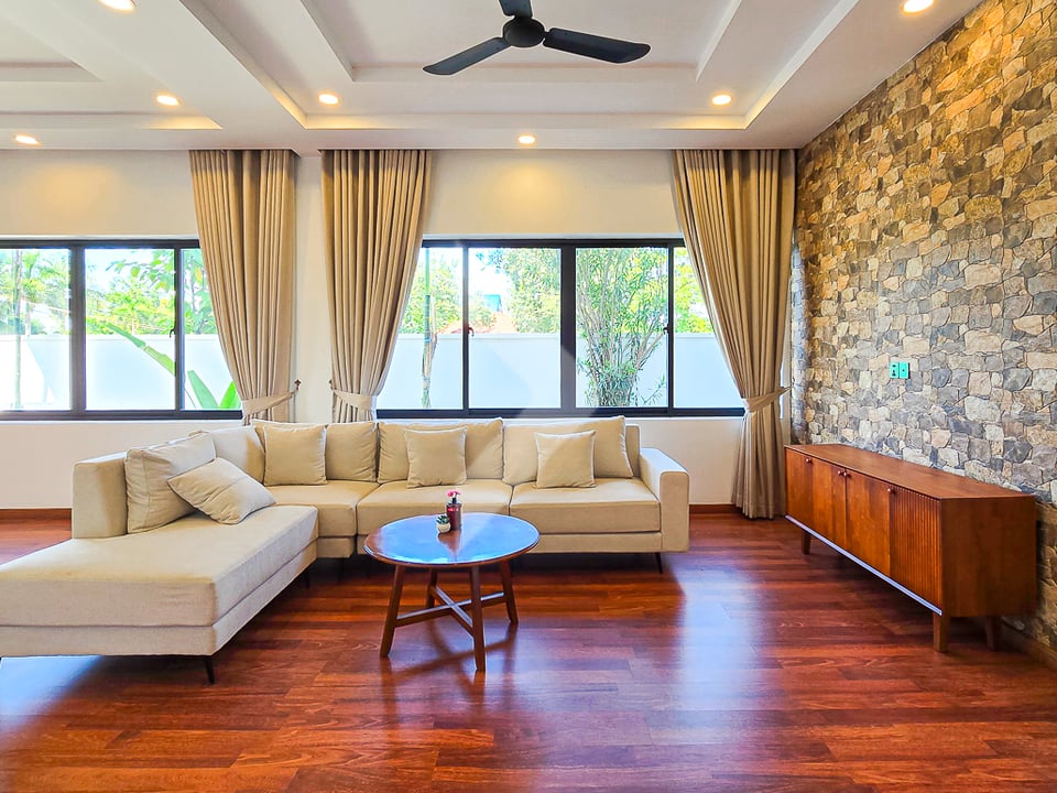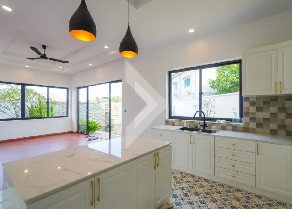 The Modern Villa Located in Svay Dangkum Commune, Siem Reap City, Surrounded by Private Villa, Hotel, Local Market, Pharmacy, only 5 minutes from Sok San Road and 8 minutes' drive to Old Market. This Beautiful Villa has Four (4) Bedrooms and Five (5) Bathrooms, two (2) Big Space of Living rooms per each floor, Kitchen and Dining area is located at the Back of Villa with Swimming Pool View. This Modern Villa has a total land area of 425 square meters, The road in front of the house is a 12-meter concrete road Connect to Wat Chak Pagoda or Ring Road 1.