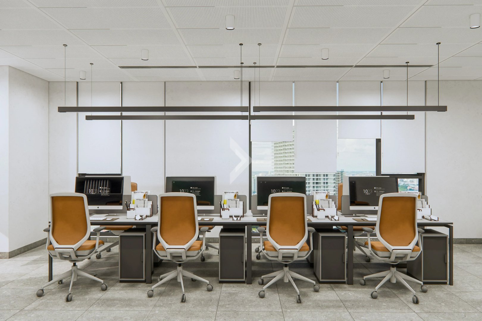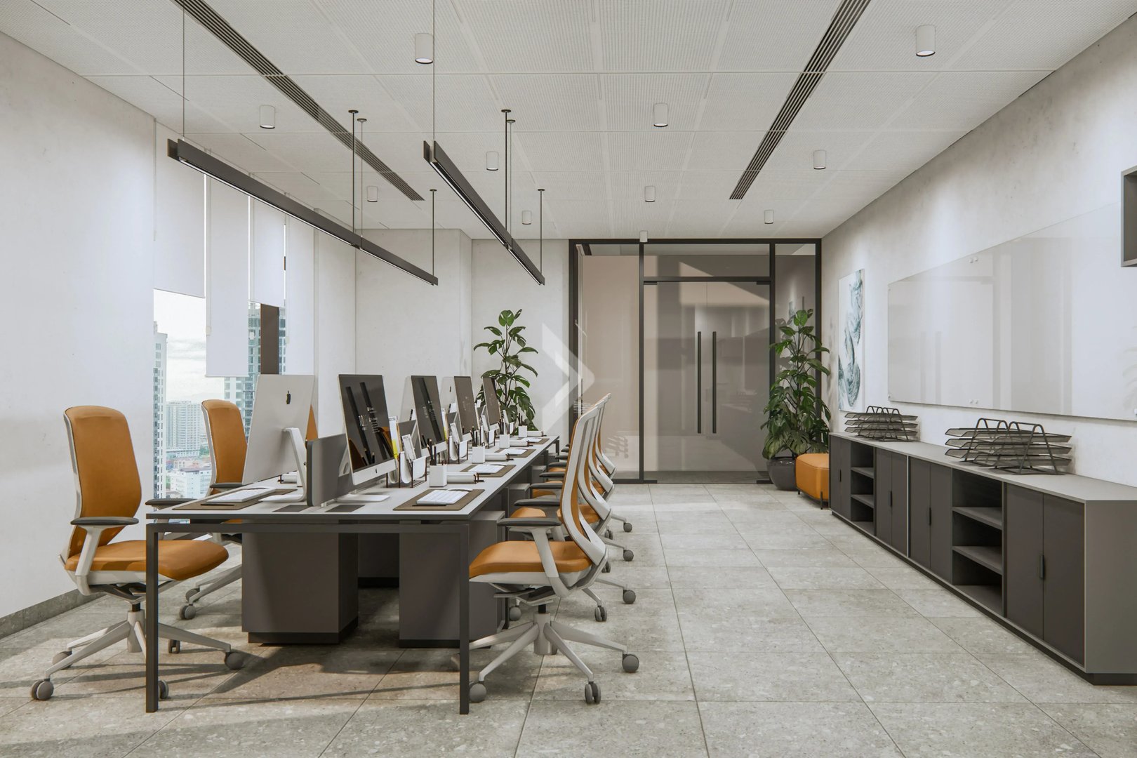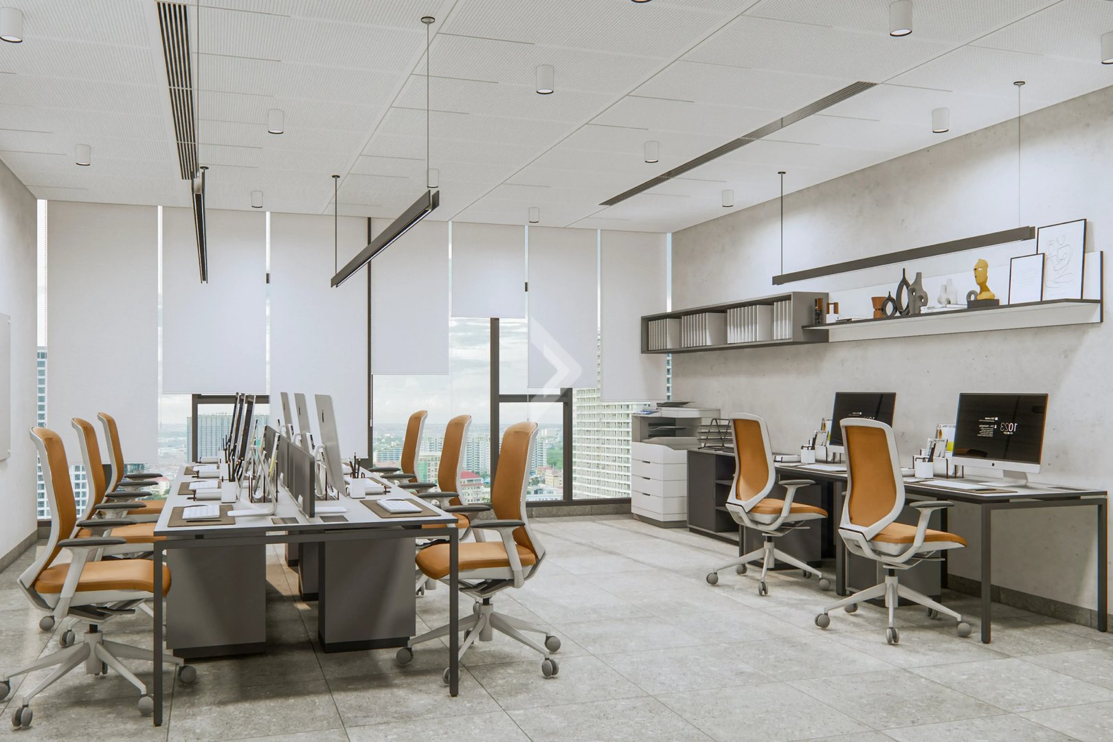 The advertisement details a commercial building with comprehensive safety features, ample parking options for cars and motorbikes, accessibility features, security measures, and shared amenities like conference rooms and restrooms. It also outlines the included services provided by the building management, various leasing options with pricing based on furniture, and ideal tenant requirements for space, employees, and parking. Specific lease term and move-in details can be negotiated upon interest.