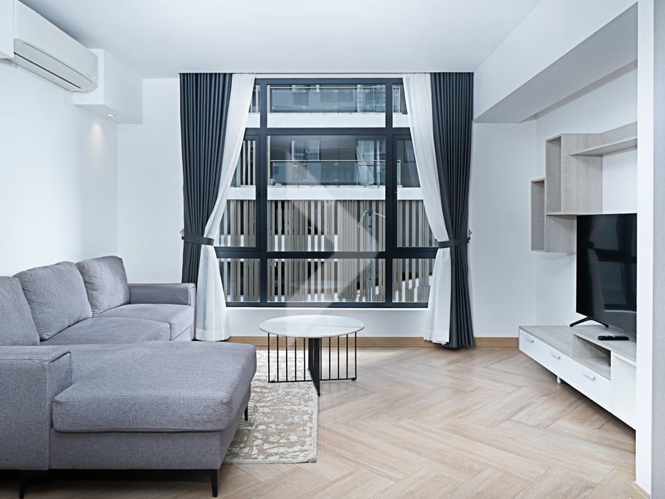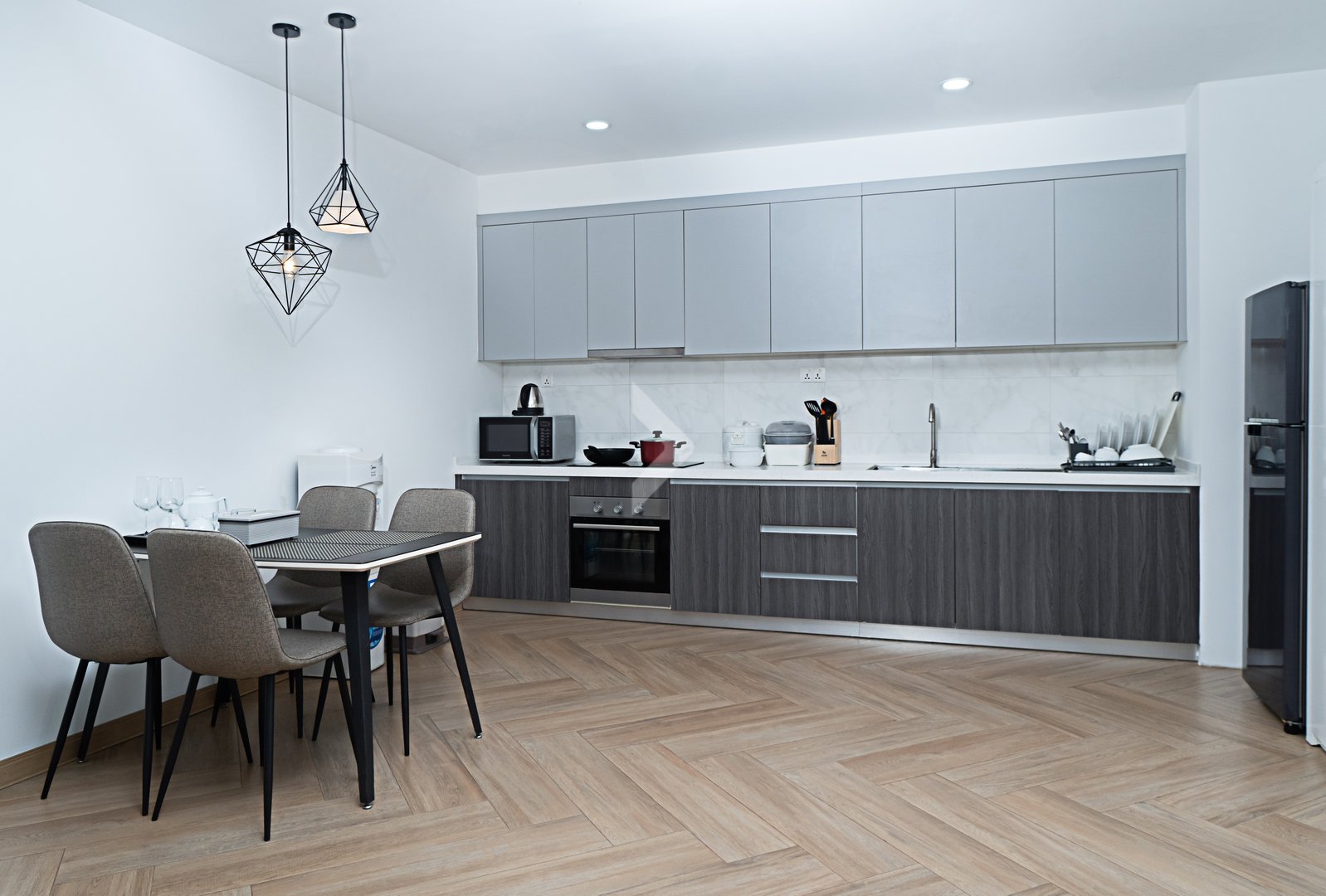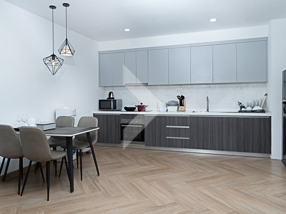 Designed with a contemporary aesthetic, the apartment features a bright living area, a sleek kitchen, and a comfortable bedroom.