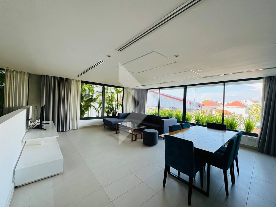 This 177 sqm condo offers two bedrooms and two bathrooms for $3,100 per month. The unit features a bright open-plan living and dining area with large windows that bring in natural light, along with a functional kitchen equipped with essential appliances. Both bedrooms are generously sized, and the master bedroom includes an en-suite bathroom. The layout provides plenty of space for comfortable city living, making it ideal for professionals or small families. The building offers 24/7 security, parking, and high-speed internet. Located in the Chakto Mukh / Doun Penh area, the condo is close to popular cafes, restaurants, shops, and cultural attractions, with convenient access to major roads and the riverside.
