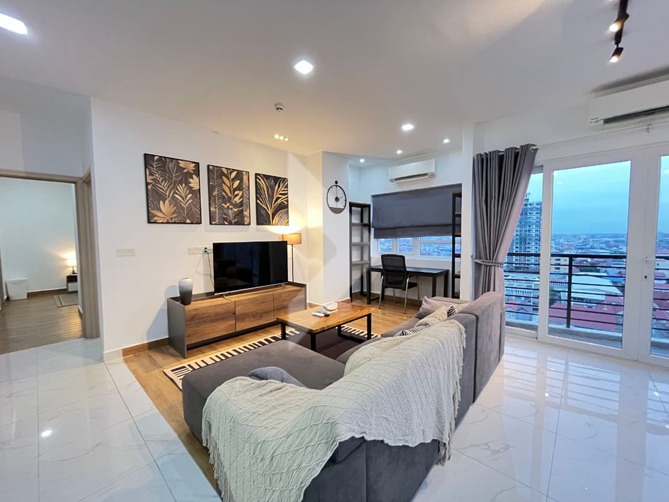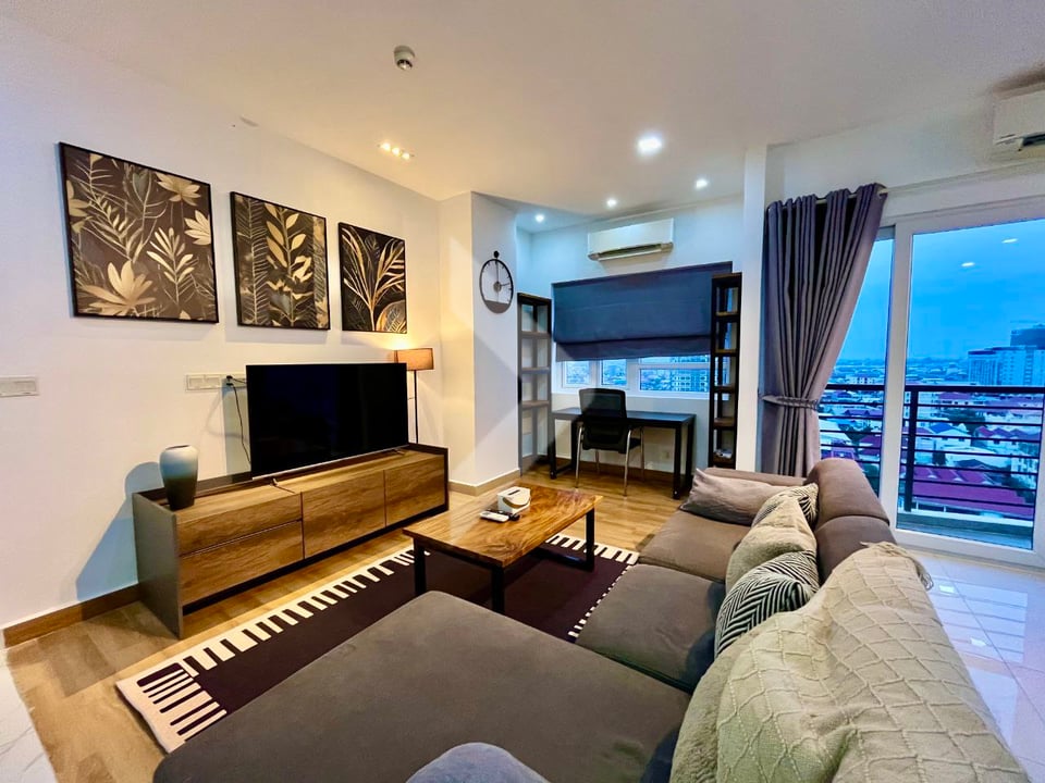 This beautifully furnished condo offers 110sqm of living space with two bedrooms and a large living room, perfect for comfortable city living. The unit comes fully furnished with a private balcony and access to excellent facilities, including a café on the ground floor, gym, steam, sauna, playground, and a swimming pool on the 14th floor.