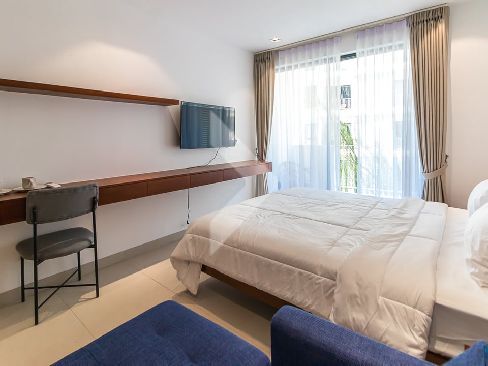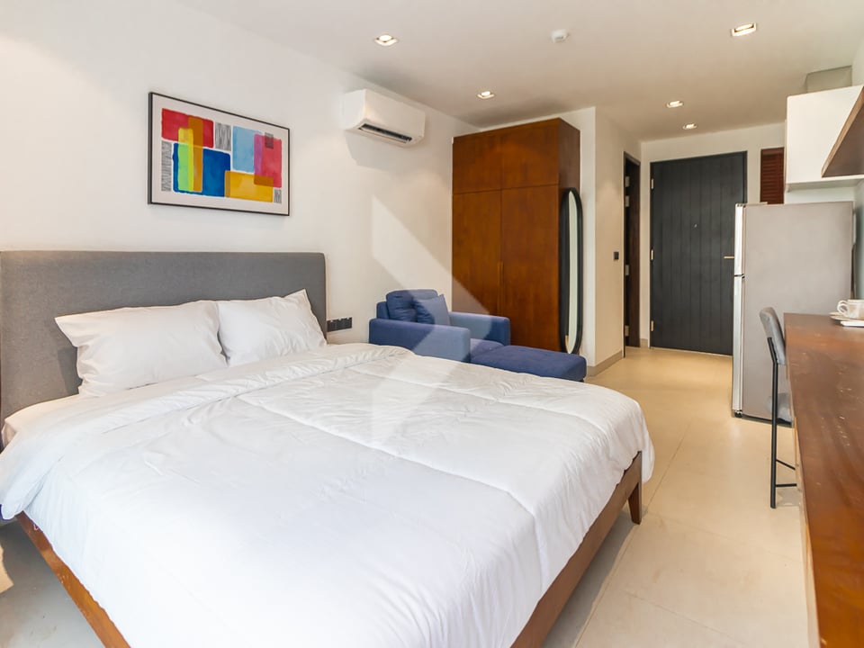 Rose Apple Square is a modern condo complex in the heart of Siem Reap, offering studio apartments for rent. Each studio is about 32 square meters, with an open layout that includes a bedroom area, a small kitchen, a bathroom, and a private balcony for natural light and fresh air. The units come partly furnished with basic furniture and appliances. Residents can enjoy great facilities like a swimming pool, gym, garden area, and on-site shops and restaurants. The location is very convenient, just a 10-minute walk from Pub Street, where you’ll find plenty of restaurants, bars, and entertainment.