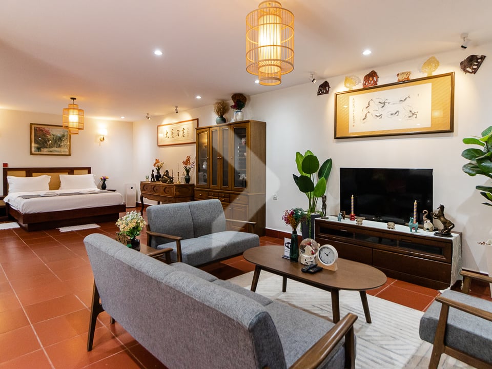 There is also a separate dining building with an extra kitchen, ideal for shared meals or entertaining. Additionally, there's a small building used as a gardener or cleaning staff room, which can also be used for sleeping.